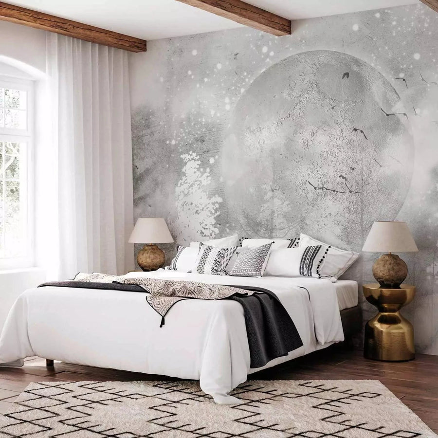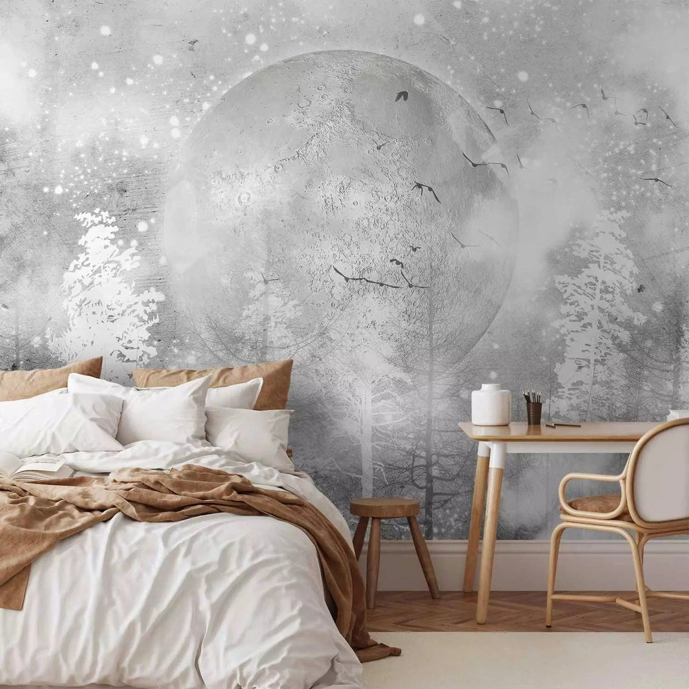 Abstrakta pelēka kompozīcija - mēness starp kokiem - guļamistabai G-ART