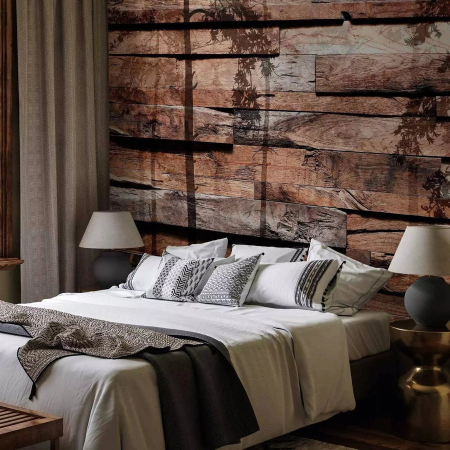 Fototapetes - Meža ēna – brūnu dēļu raksts ar koku ēnām, 63906