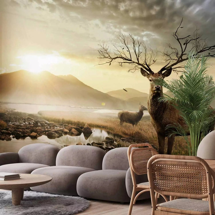 Fototapetes - Briedis pie kalna strauta, saulainos toņos G-ART