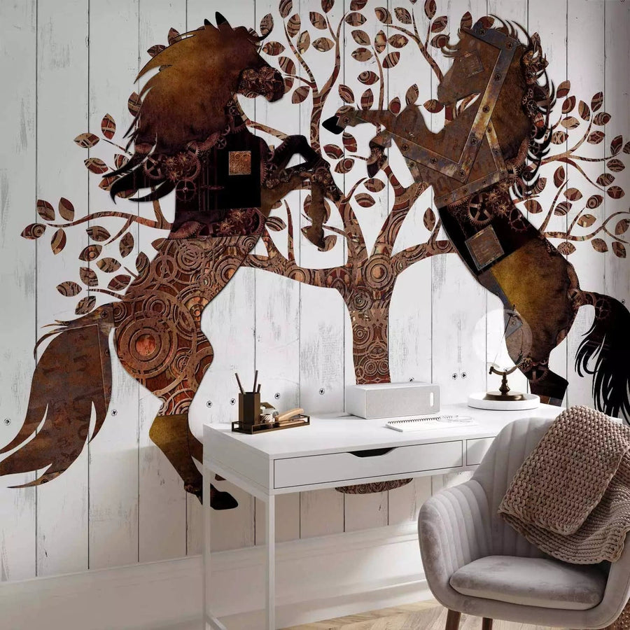 Fototapetes - Koks ar dzīvniekiem uz balta koka fona, 64373  G-ART