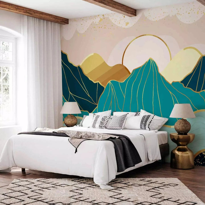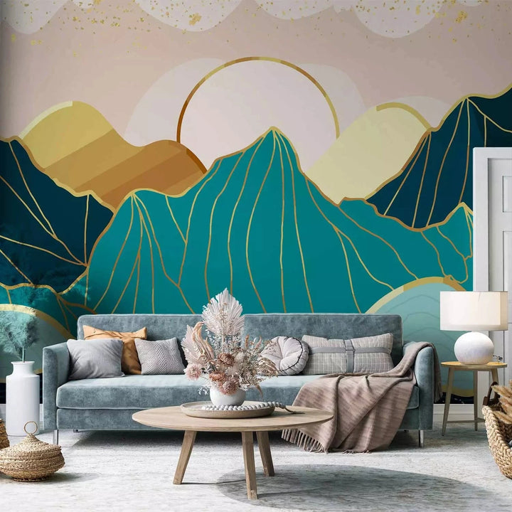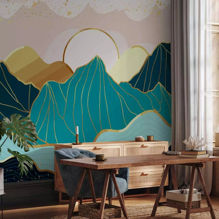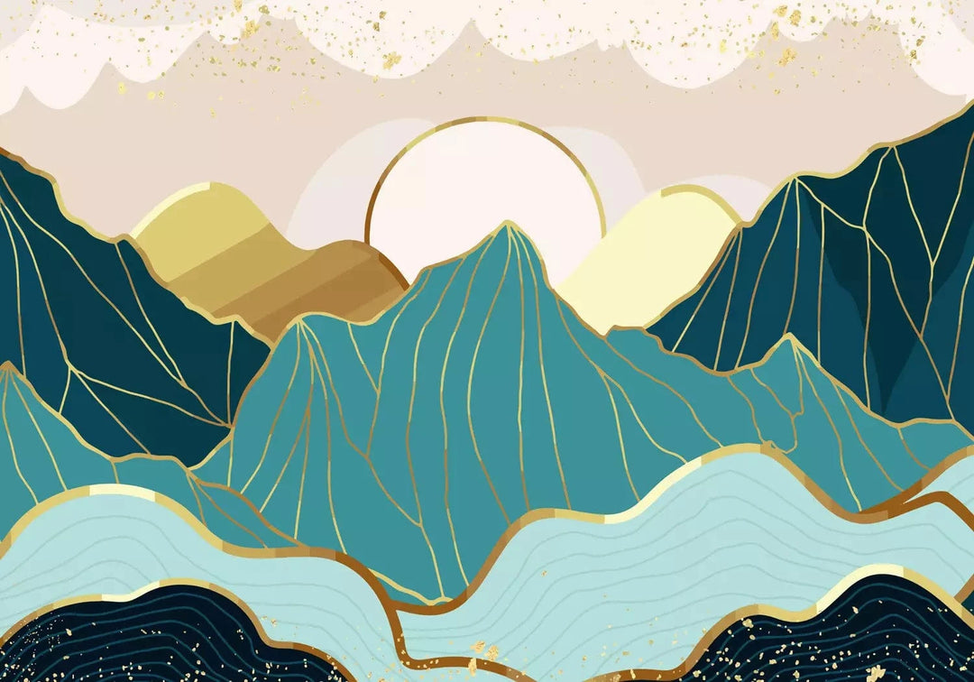 Fototapetes - Abstrakta ainava ar kalniem zilos toņos un zelta akcentu, 137469