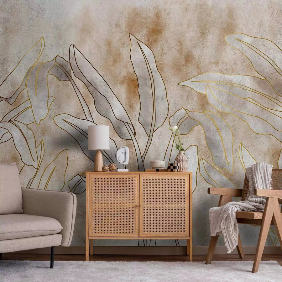 Fototapetes - zelta lapu kompozīcija uz betona tekstūras fona G-ART