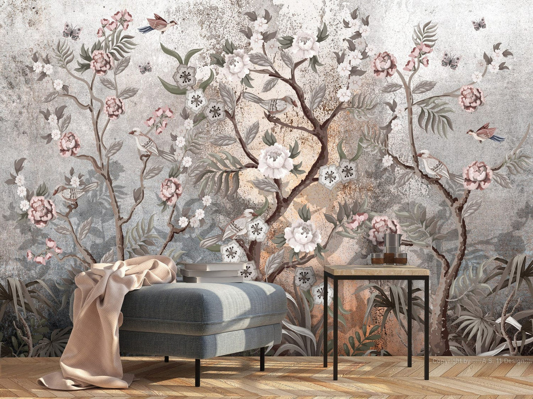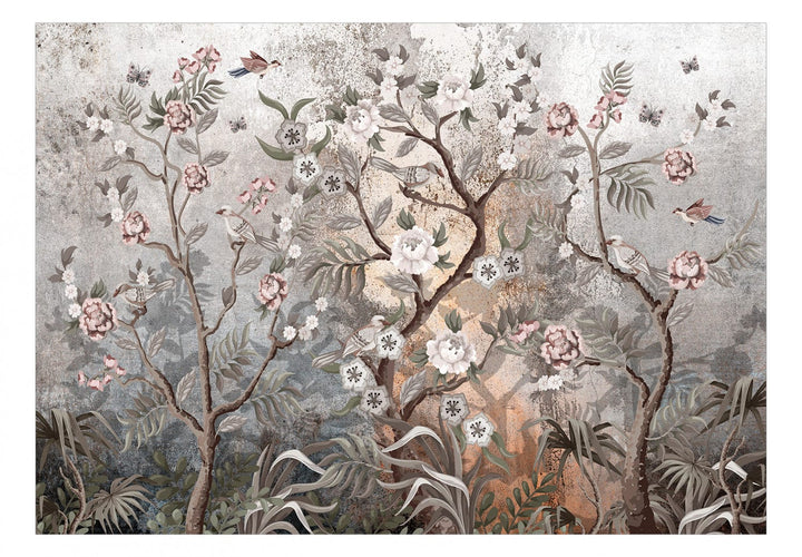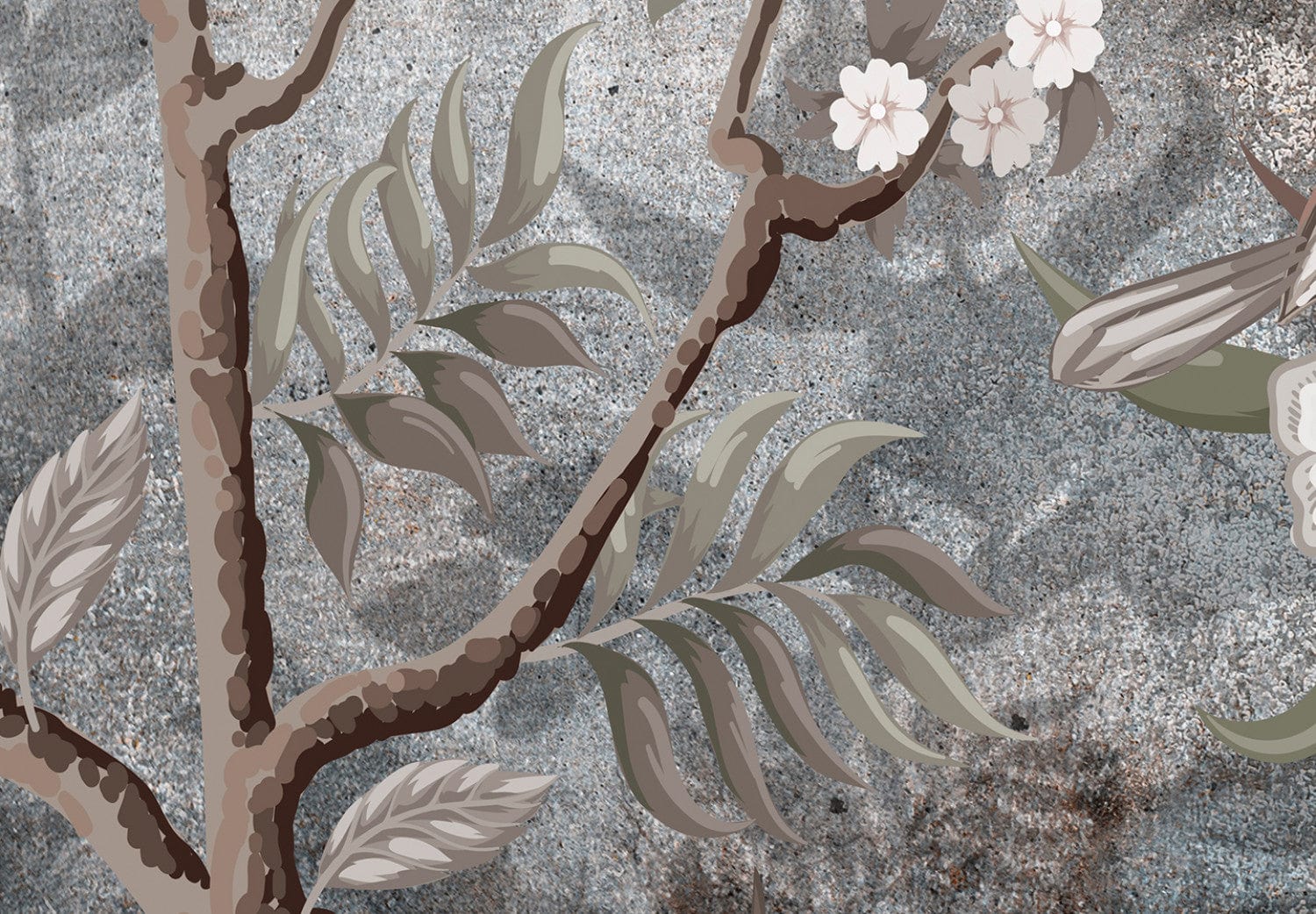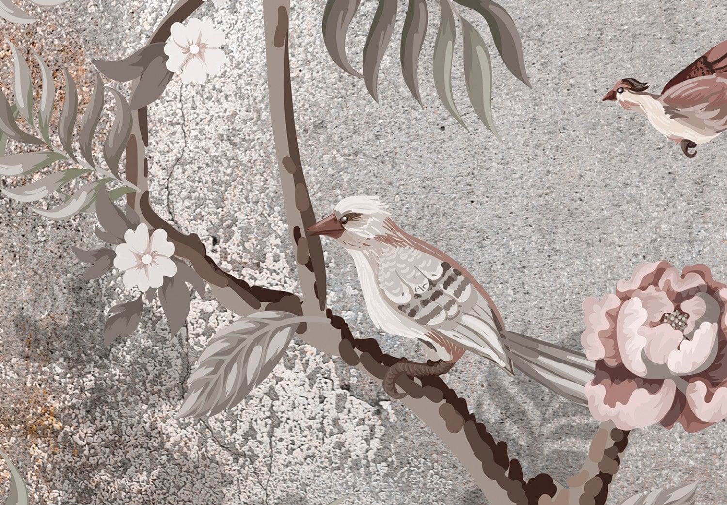Fototapetes ar putniem uz ziediem, pelēkā un rozā, 138587