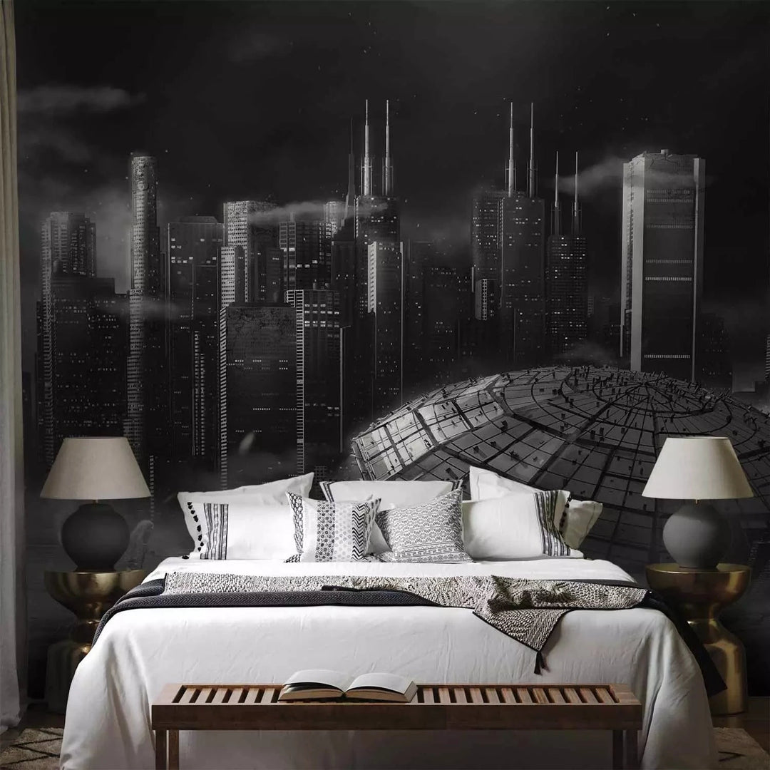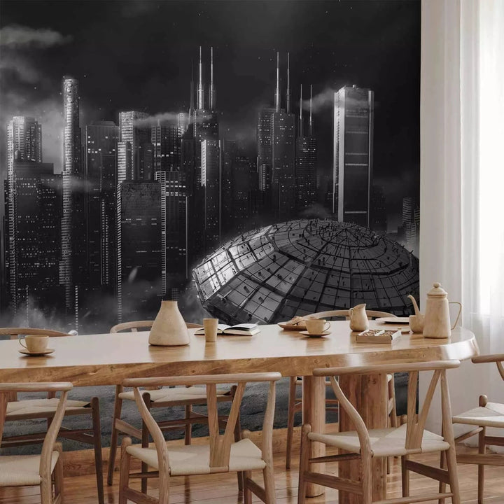 Fototapetes - Fantastikas ainava ar debesskrāpjiem un kosmosa kuģi, 60598