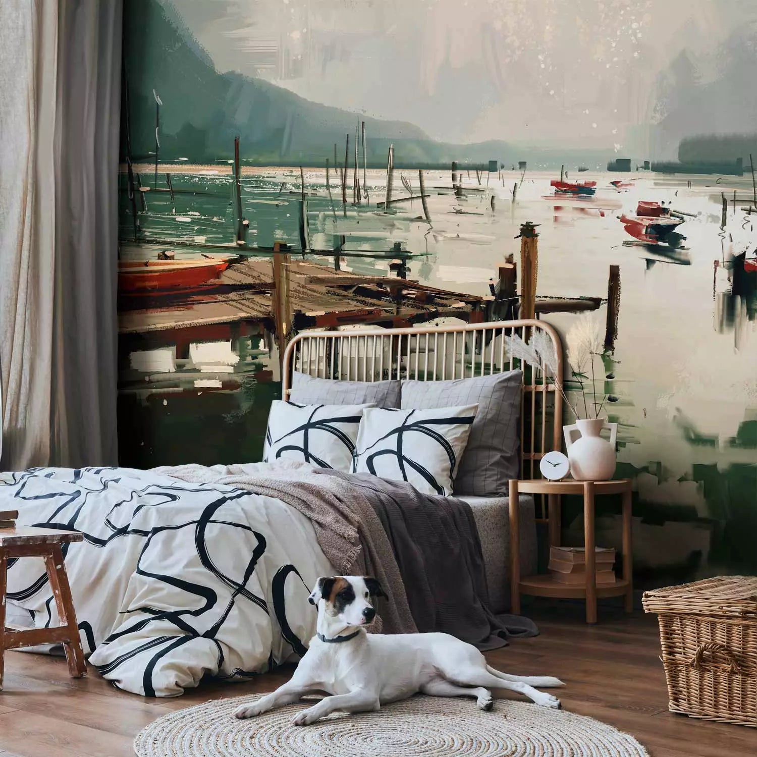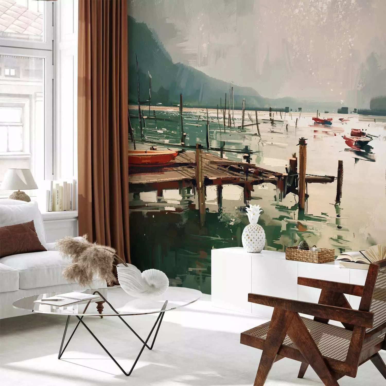 Fototapetes - Glezniecības skice, rīts, ainava ar laivu un kalniem fonā, 150574