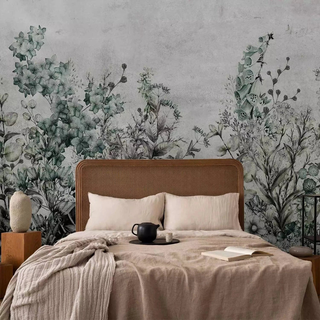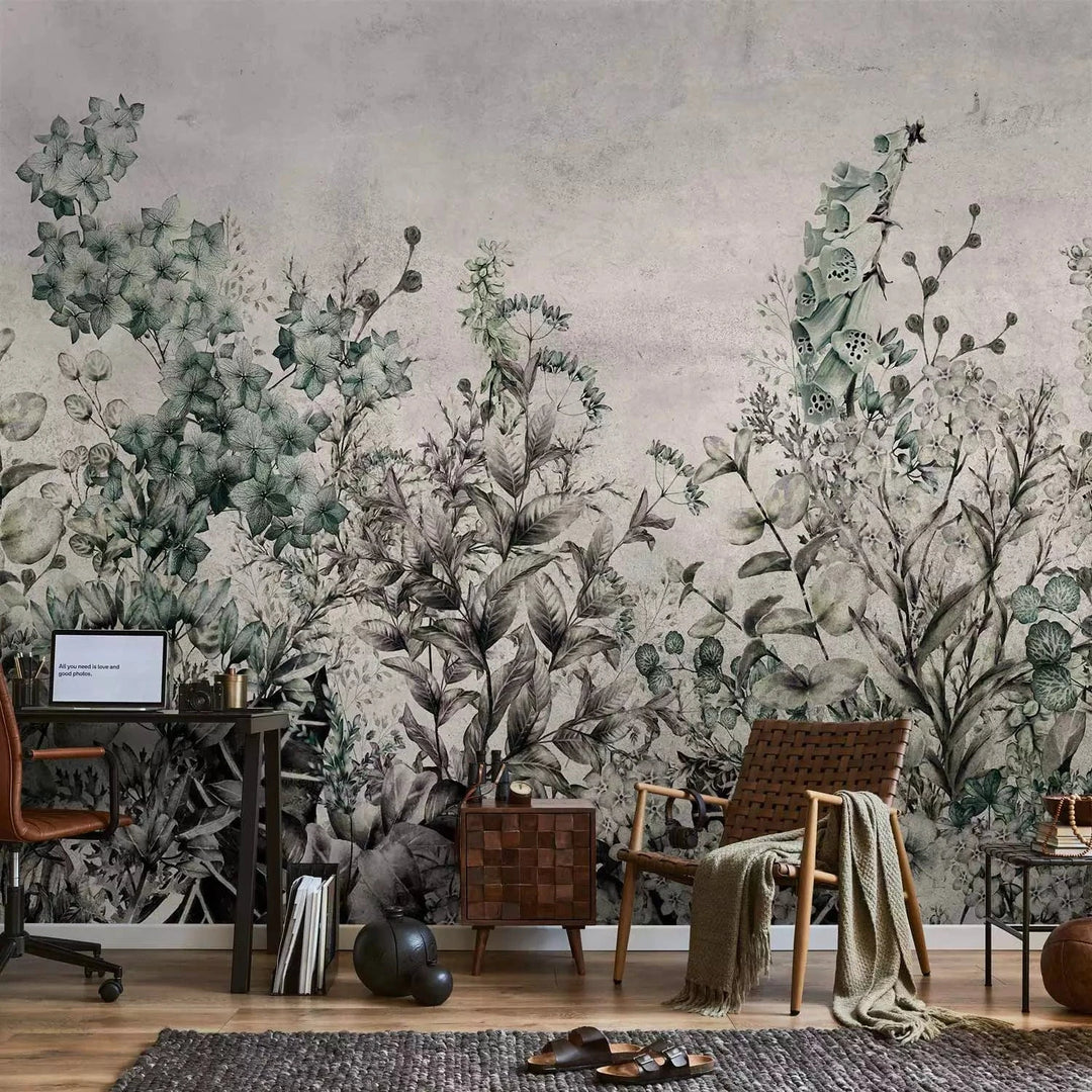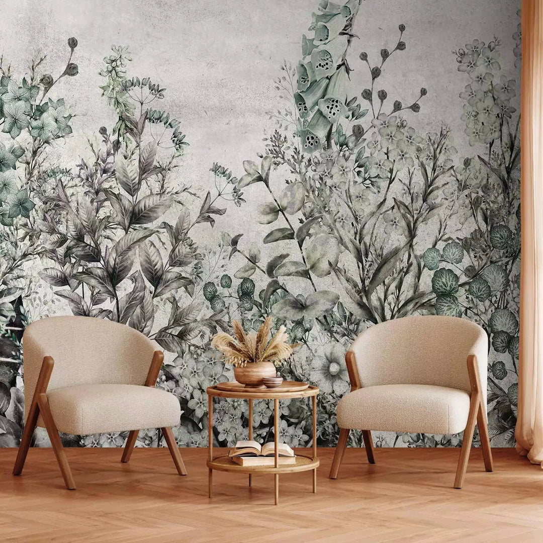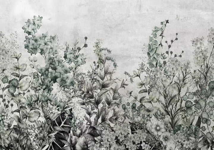 Fototapetes - Ziedu pļava – retro stila dabas motīvs vēsos zaļos toņos, 135375