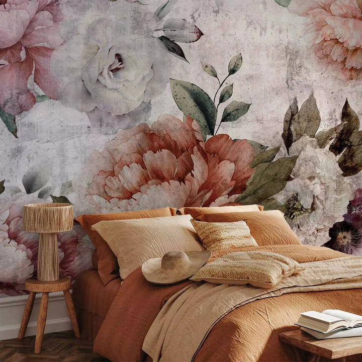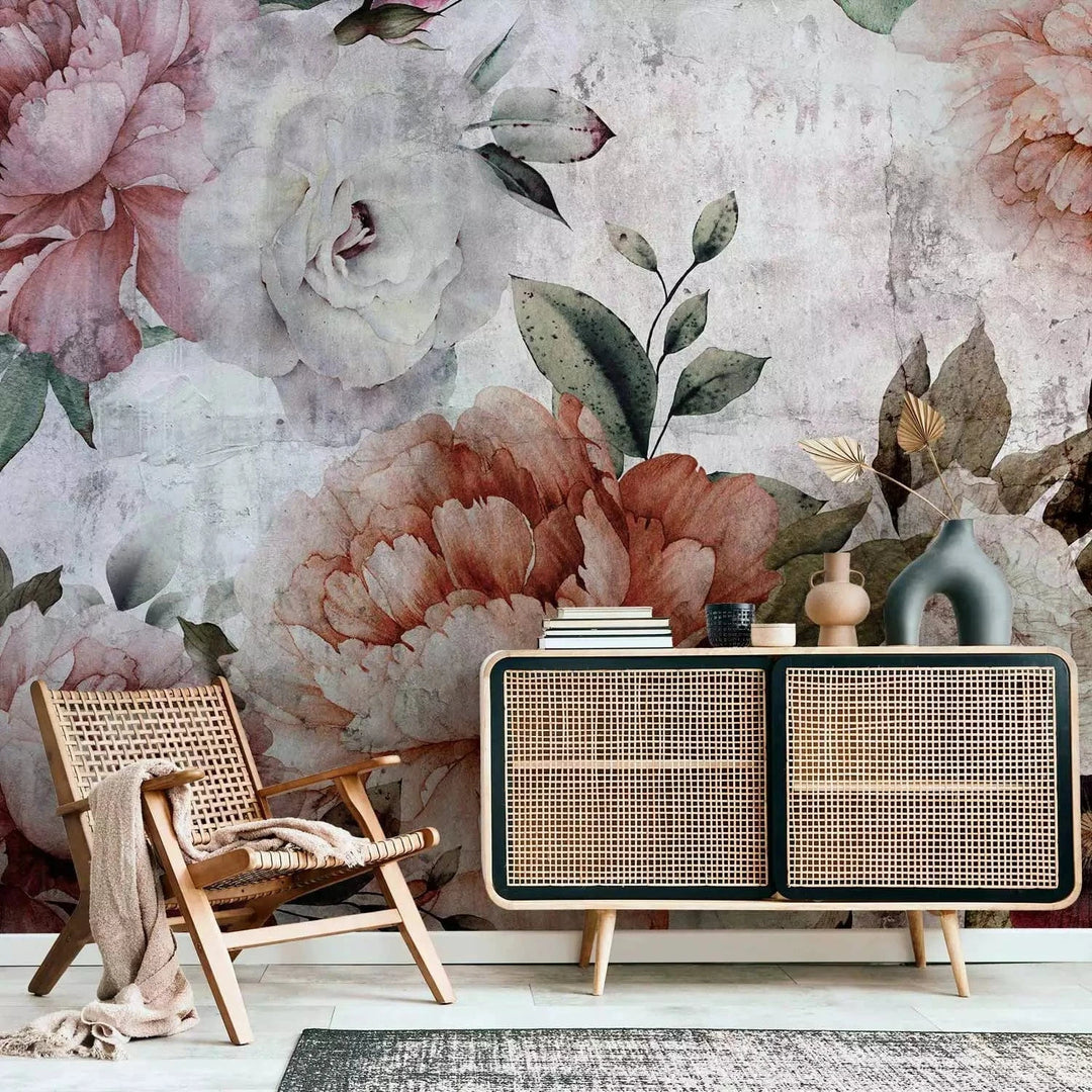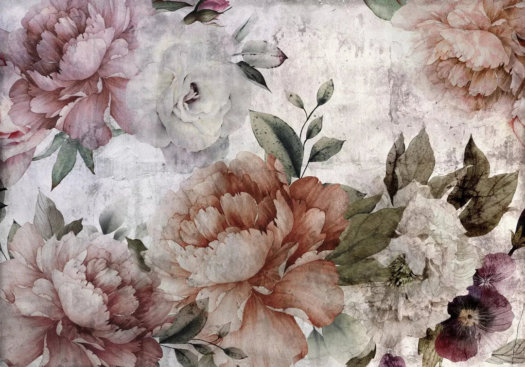 Fototapetes - Ziedu aromāts - ziedu motīvs uz balta fona retro stilā, 137303
