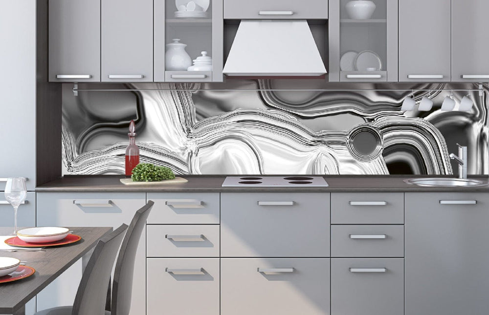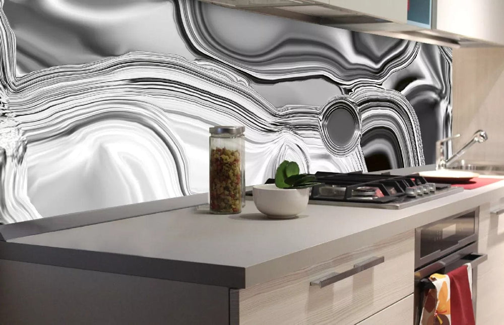 Fototapetes virtuvei ar lamināciju, pašlīmējošas plēve un flizelīns - Šķidrais hroms (Sudraba krāsā) (180x60 cm)