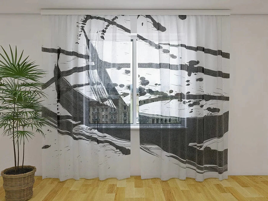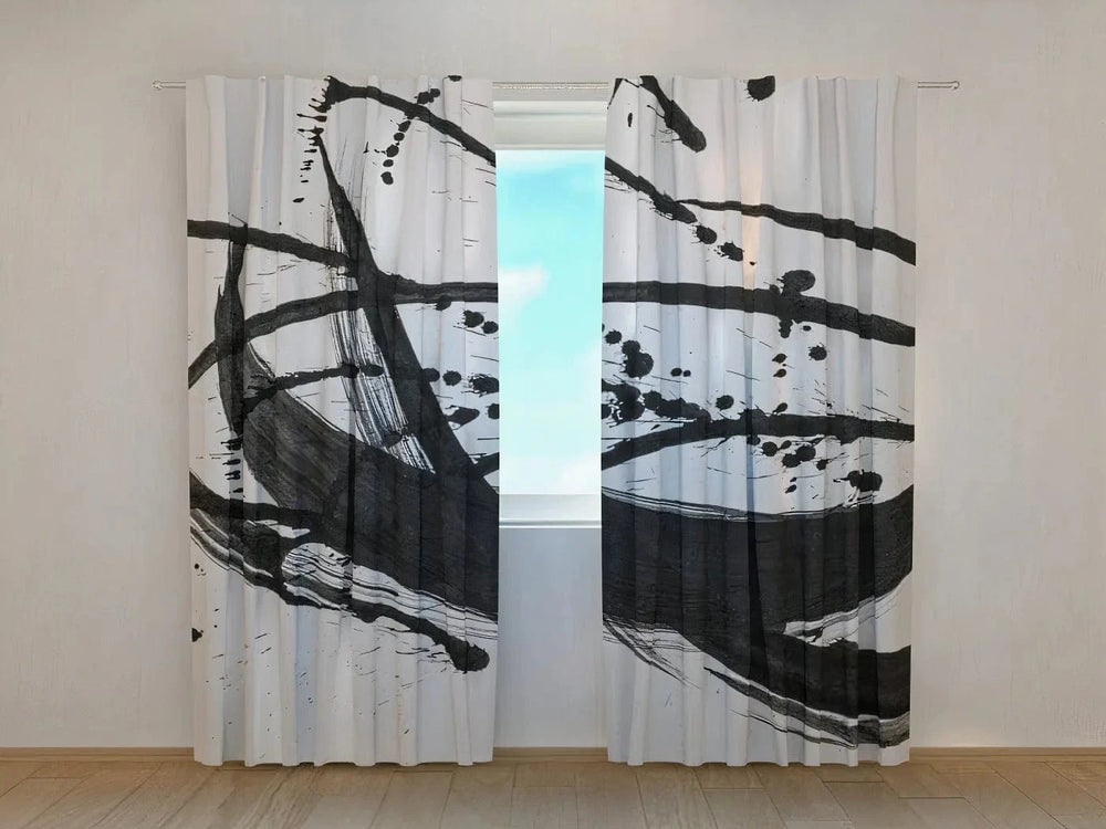 Dienas un nakts aizkari ar abstrakciju - Melnā abstrakcija Tapetenshop.lv