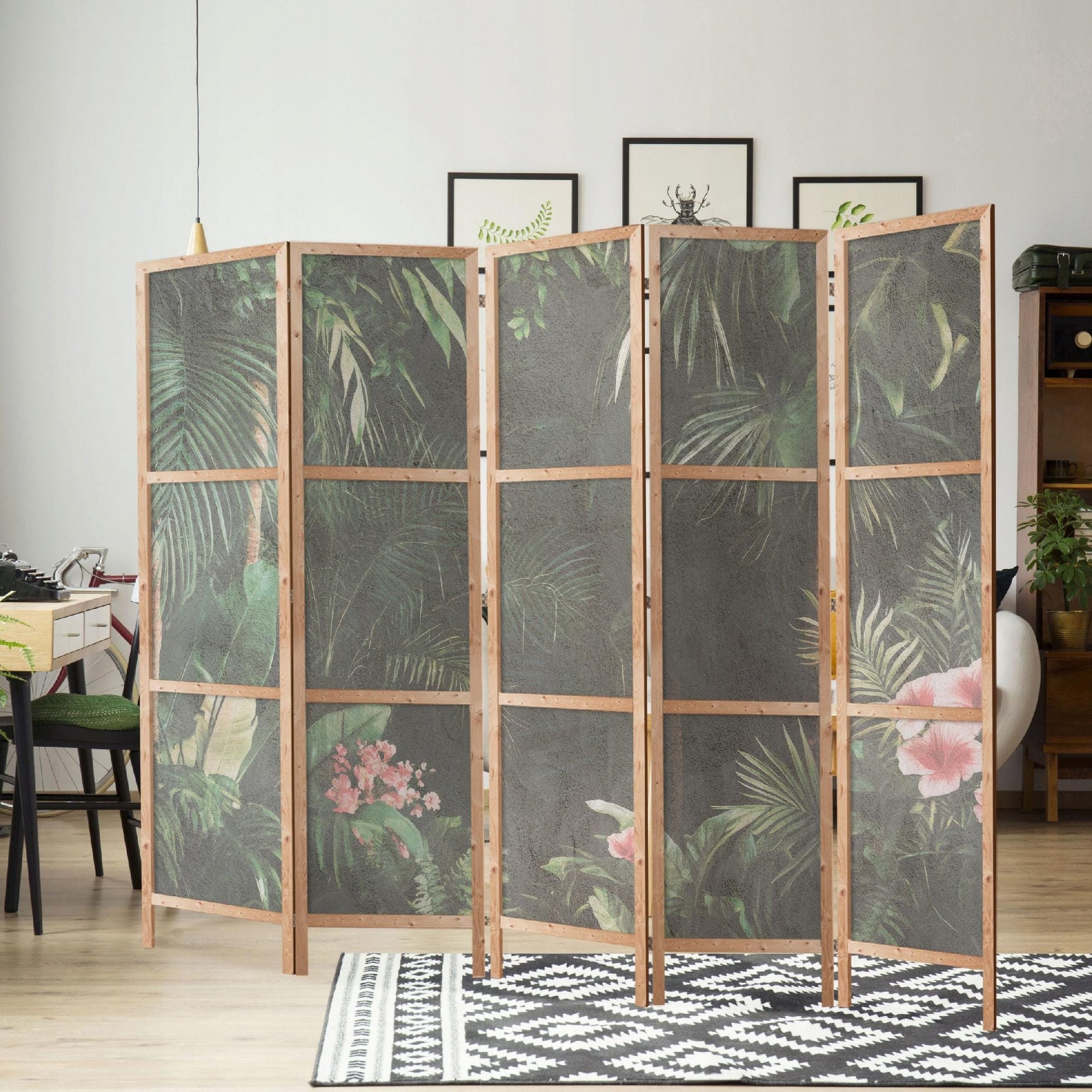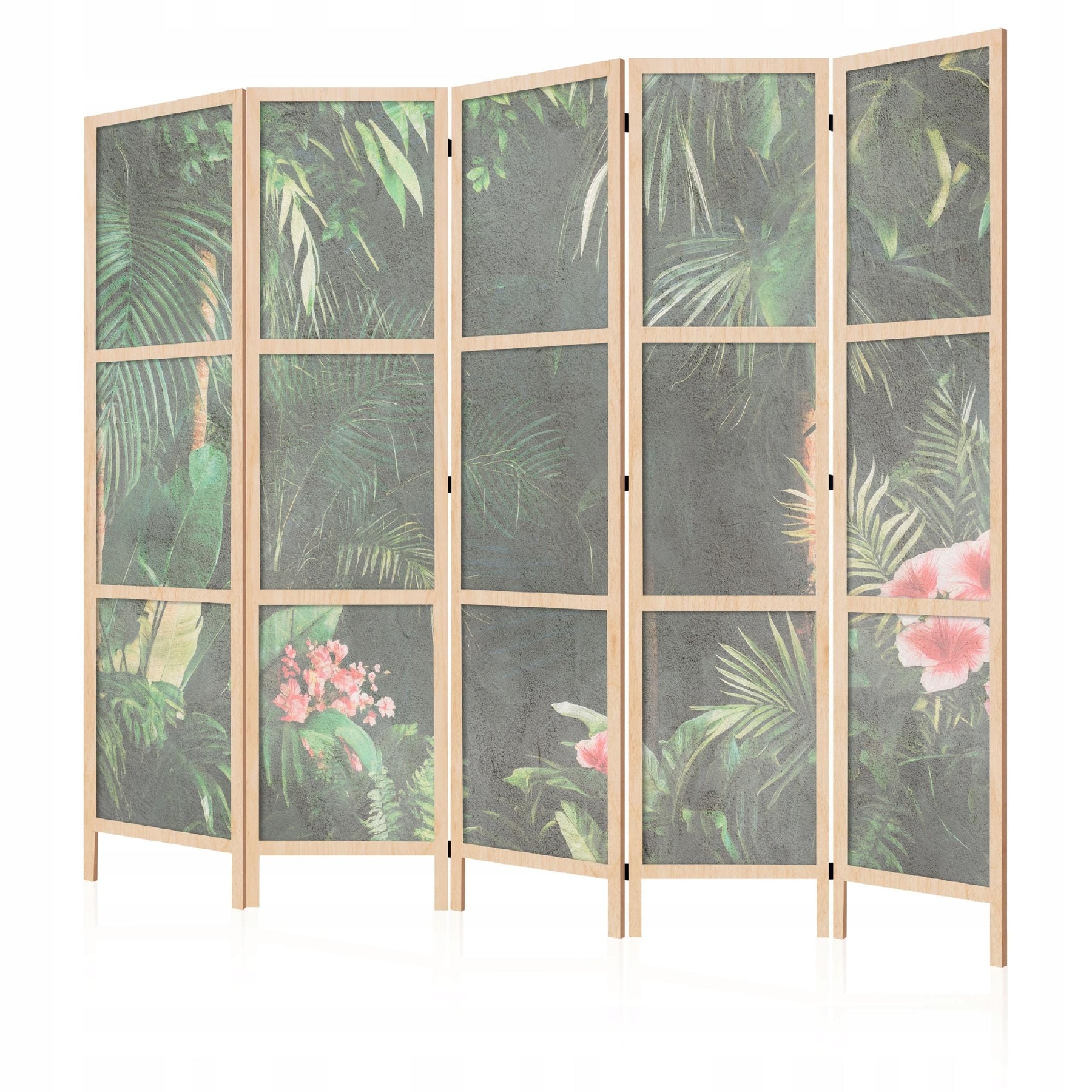 Dekoratīvs japāņu aizslietnis, vienpusējs 225x172, Tumšs aizslietnis ar tropu lapām un rozā ziediem