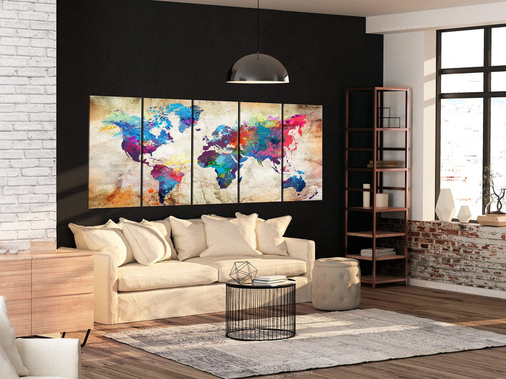 Glezna - Pasaules karte: krāsaini kontinenti uz pelēka fona, 91919 G-ART.