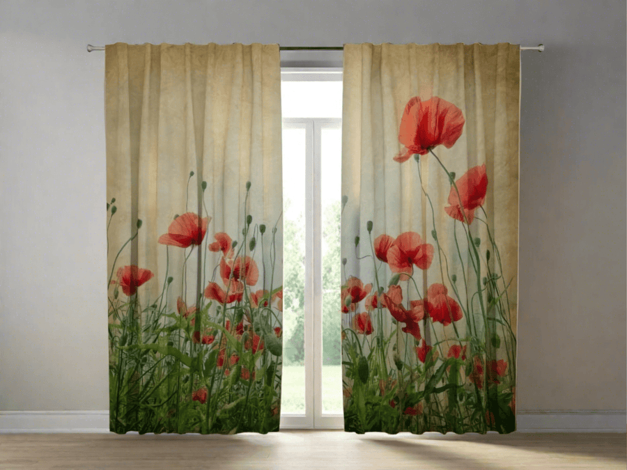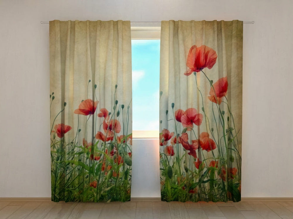 Nopirkt dienas un nakts aizkarus viesistabai ar sarkanām magonēm Tapetenshop.lv