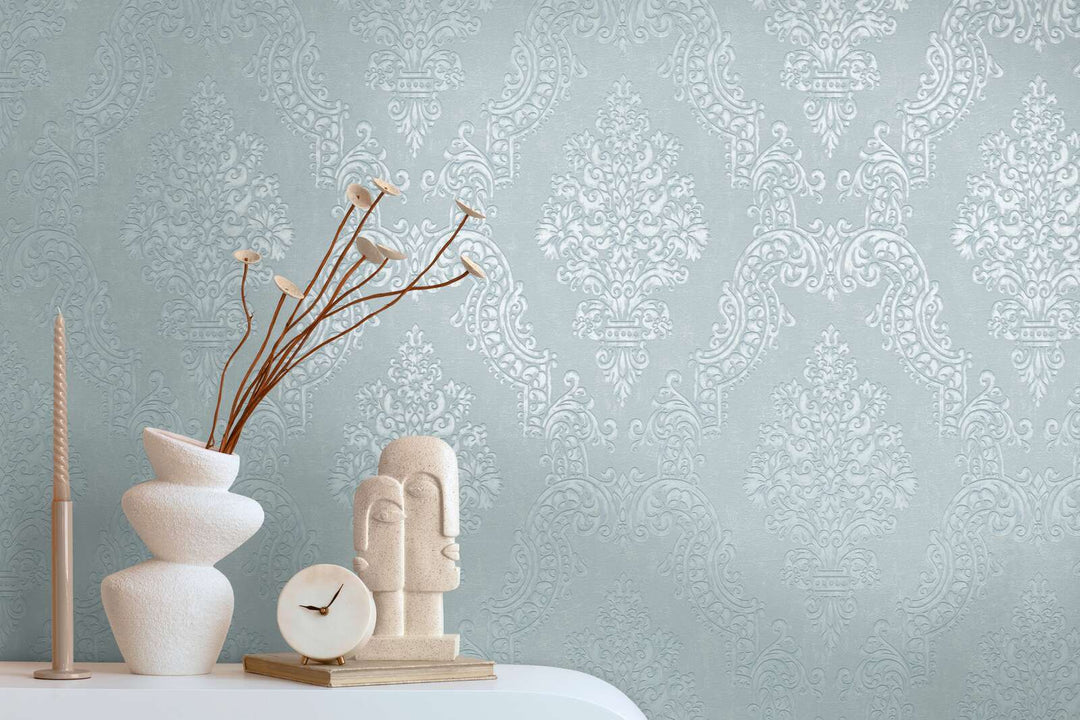 Flizelīna tapetes baroka stilā ar mirdzuma efektu – zaļgani pelēka krāsā - 1410525