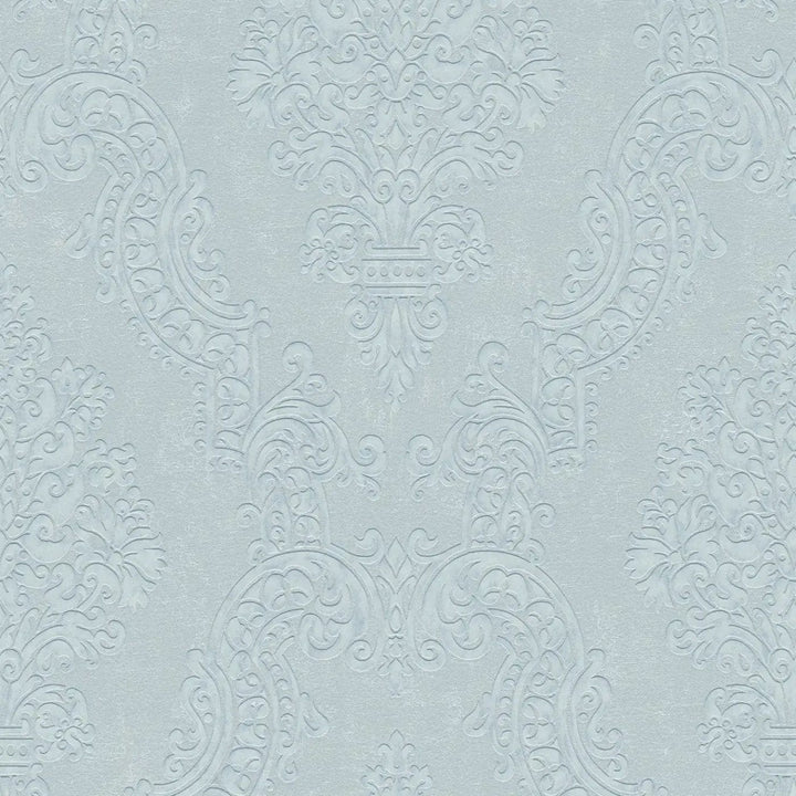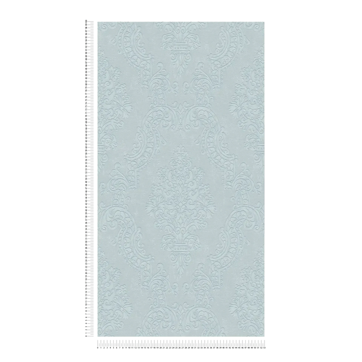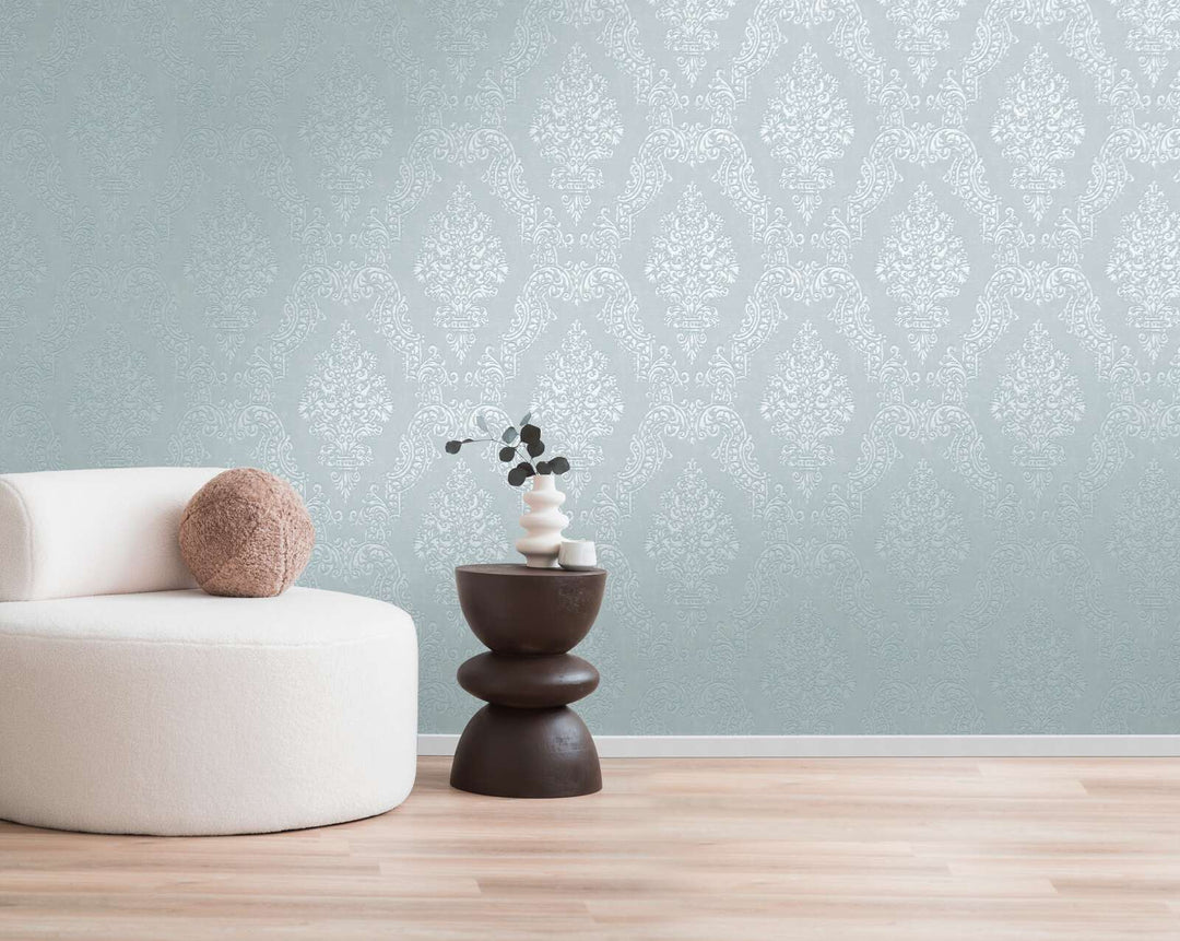 Flizelīna tapetes baroka stilā ar mirdzuma efektu zaļgani pelēkā krāsā (1410525), izmērs 0,53x10 m. Neausts materiāls, teksturēta un matēta virsma ar vieglu spīdumu – klasiskai, bet modernai atmosfērai.