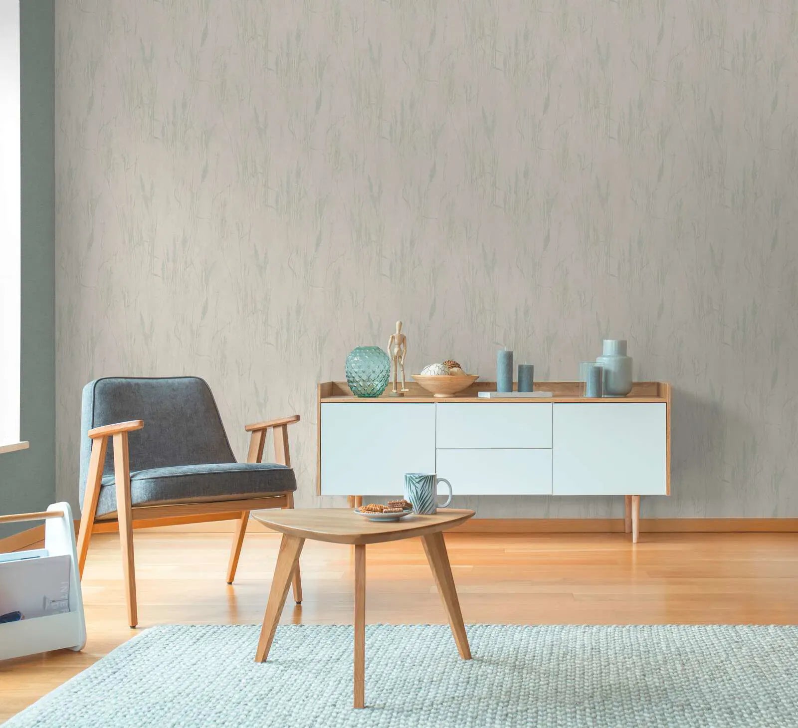 Delikāts, no dabas iedvesmots tapetes raksts ar smalkām, gandrīz caurspīdīgām stublājiem un filigrāniem kukurūzas vārpiņām, kas izvietotas maigās vertikālās līnijās visā virsmas platībā. Pamata krāsa ir maiga, gaiši smilškrāsa vai krēmkrāsa, kas motīvam piešķir smalku, neuzkrītošu eleganci. Zāles ir pasteļtoņos zaļā un ļoti gaiši zilā krāsā, tāpēc tās tikai nedaudz izceļas uz fona un rada mierīgu, neuzkrītošu iespaidu. Kopējais iespaids ir maigs un sapņains, atgādinot vieglu vasaras brīzi klusā pļavā. Krāsu gamma un akvareļveida dizains uzsver dabisku, skandināvu iedvesmotu stilu, kas rada viegluma un plašuma sajūtu un piešķir telpām patīkamu nomierinošu efektu.