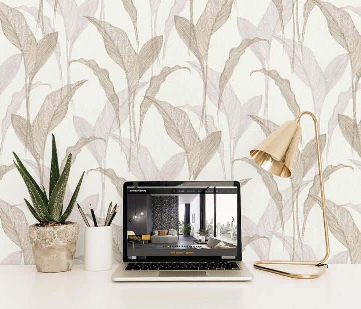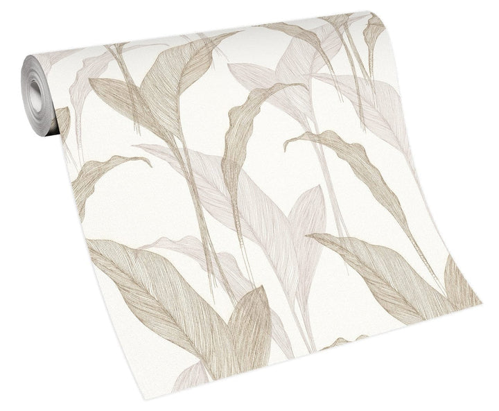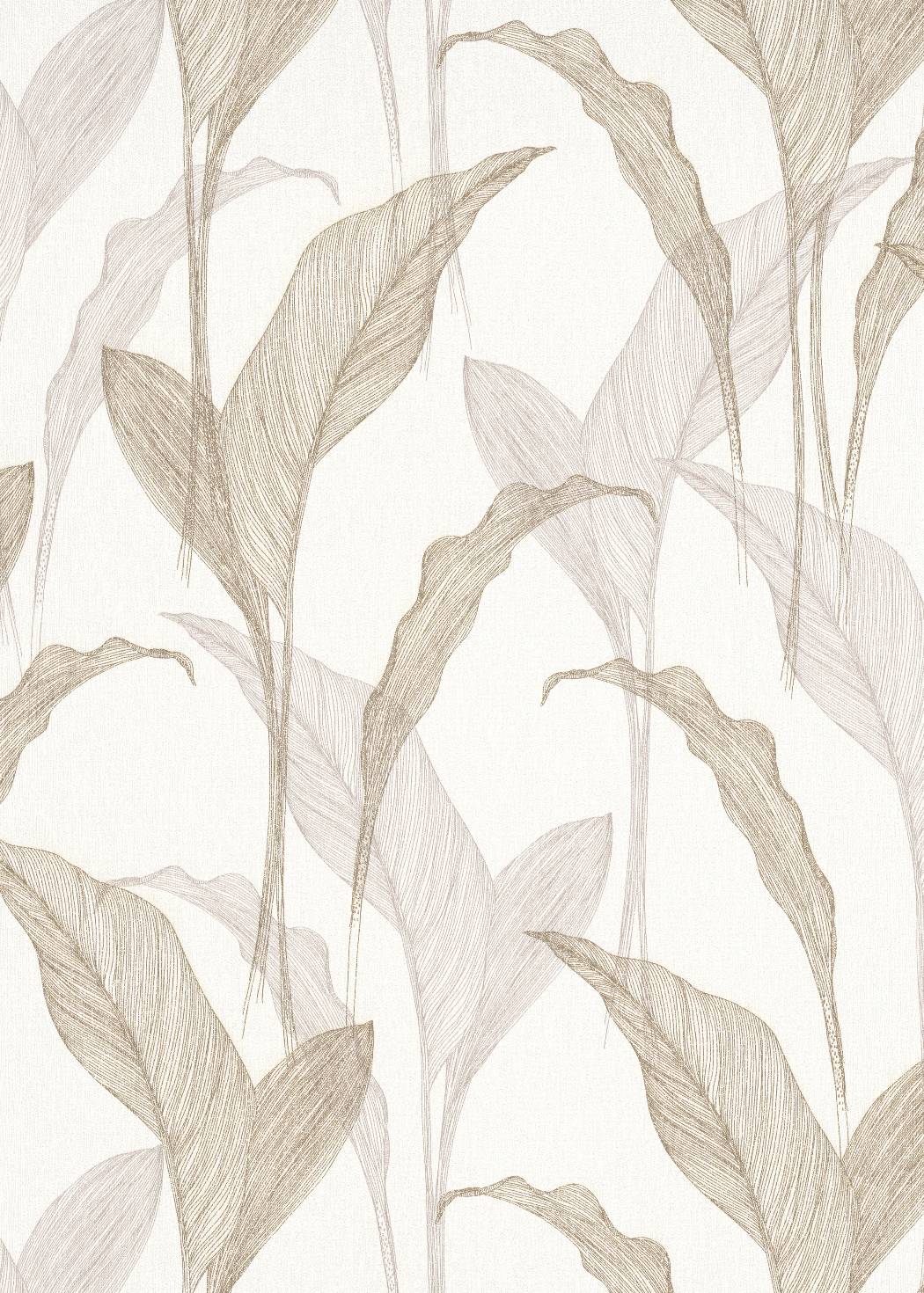 Tapetes 3711436 ir augstas kvalitātes botāniska rakstura tapetes ar elegantām lapām skaistā bēša, krēmkrāsas un zelta krāsas kombinācijā. Tās augstā kvalitāte un izsmalcinātais dizains radīs greznu efektu jūsu mājās.