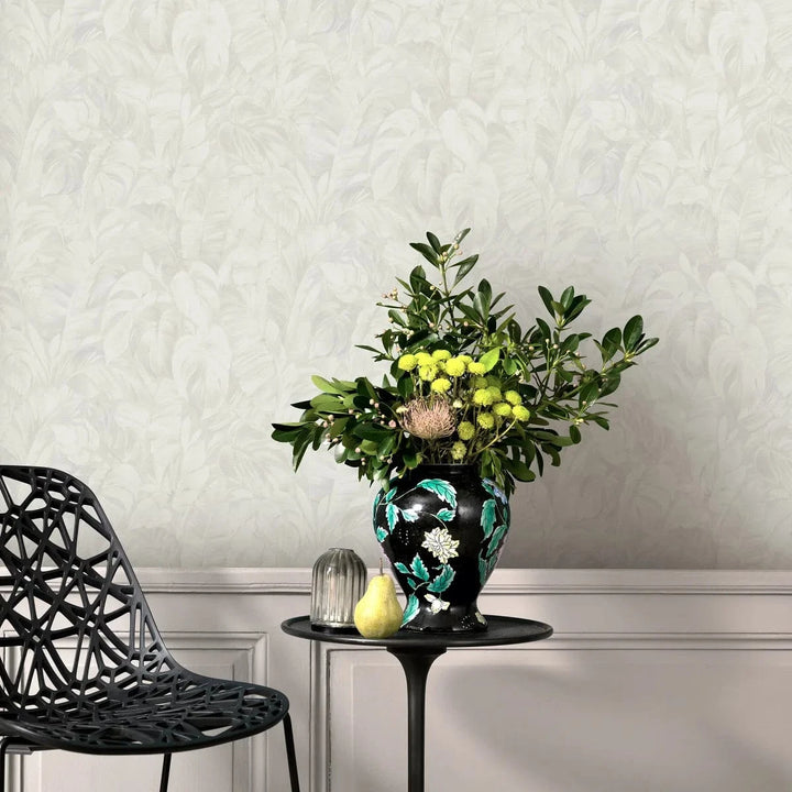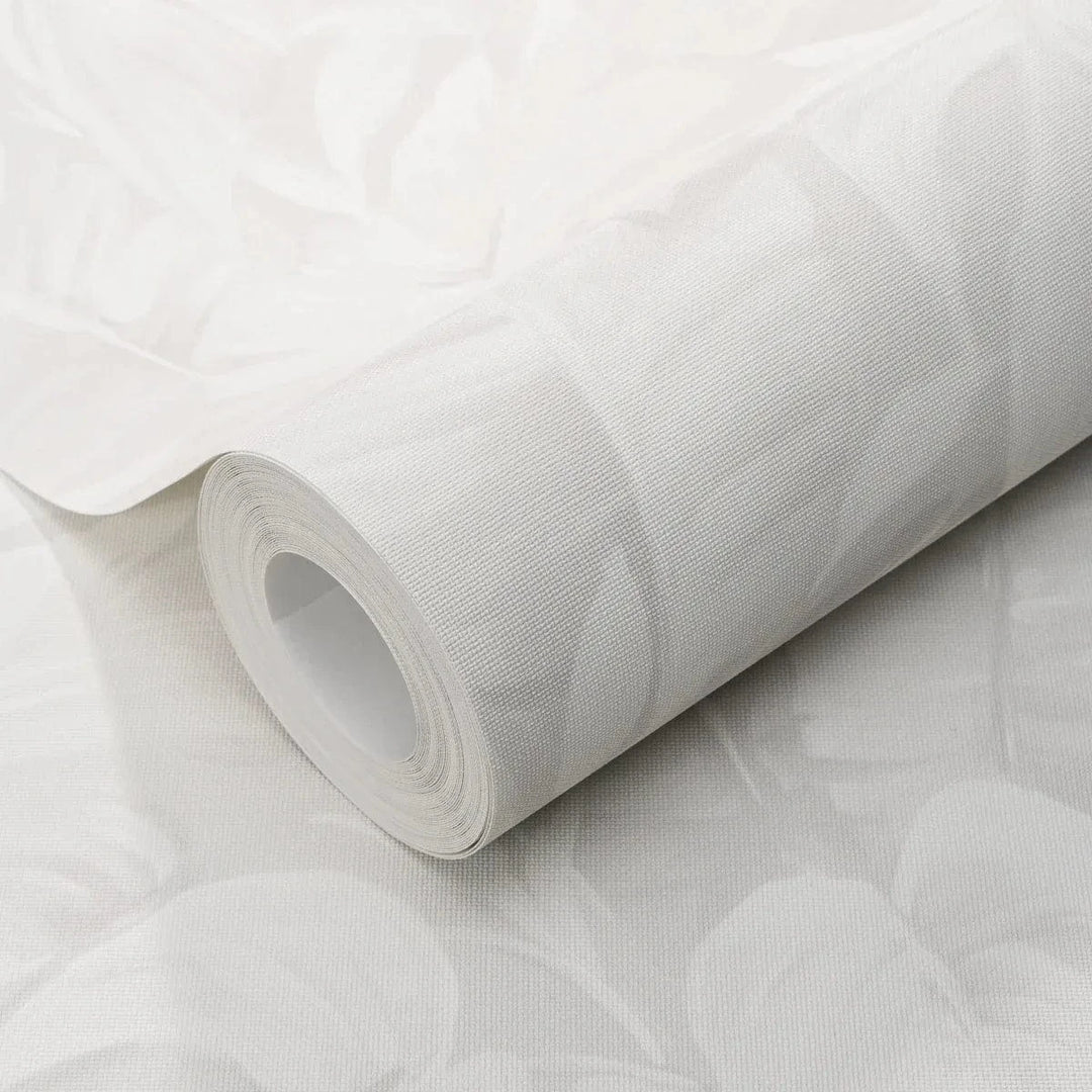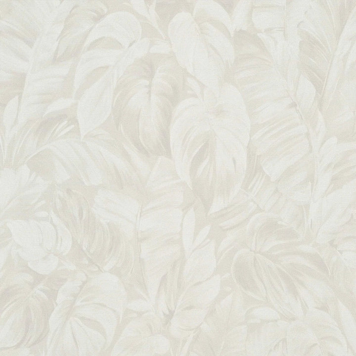 Tapetes ar zīmētam tropiskām lapām uz tekstila faktūras, gaiši pelēkas - 3762337