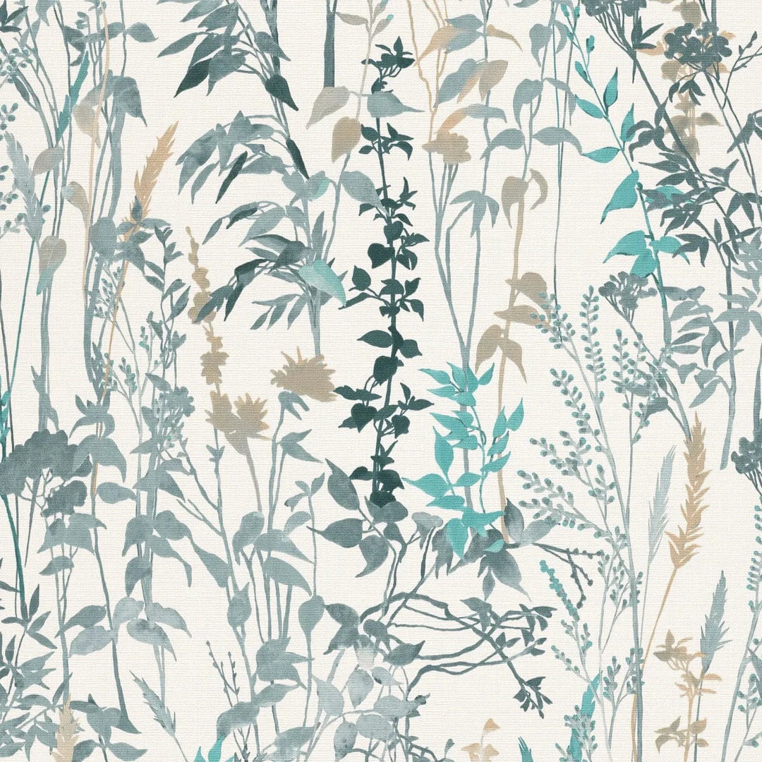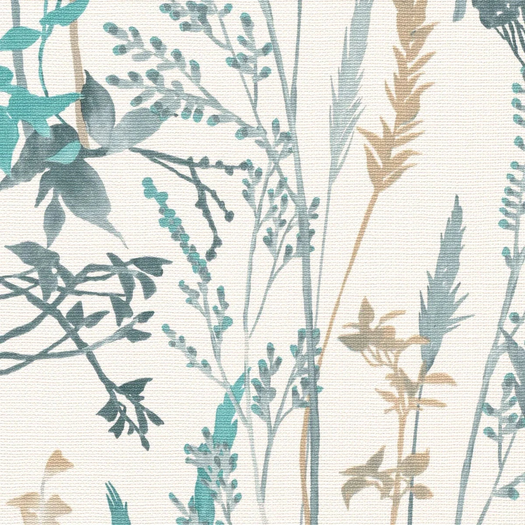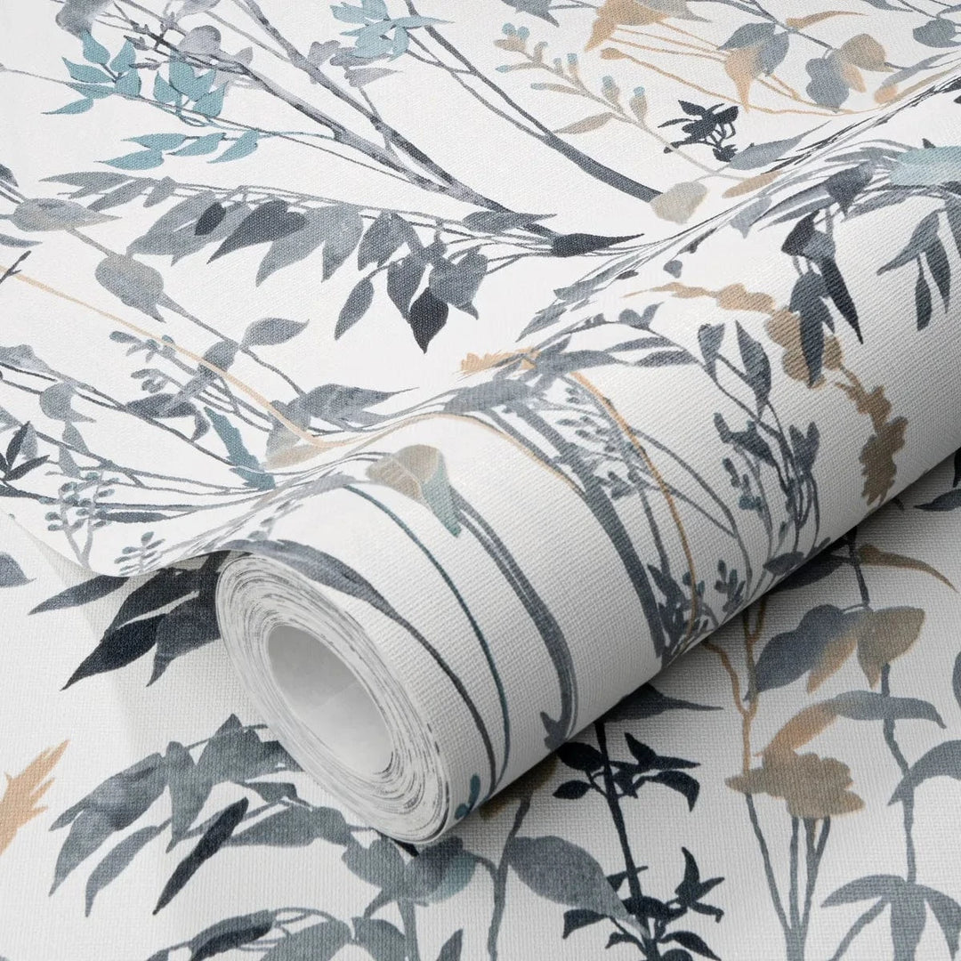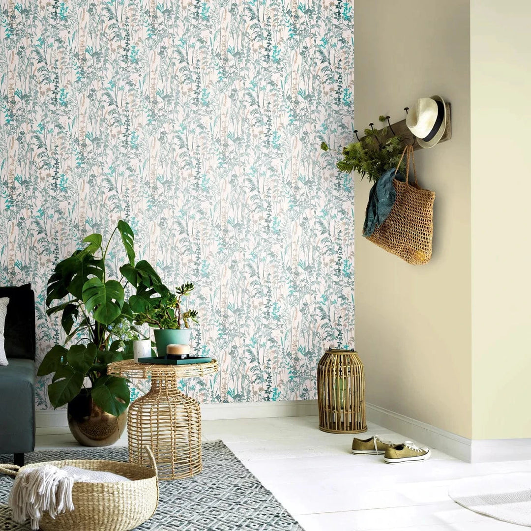 Lauku stila tapetes ar smalkiem augu motīviem uz balta fona rada romantisku noskaņu.