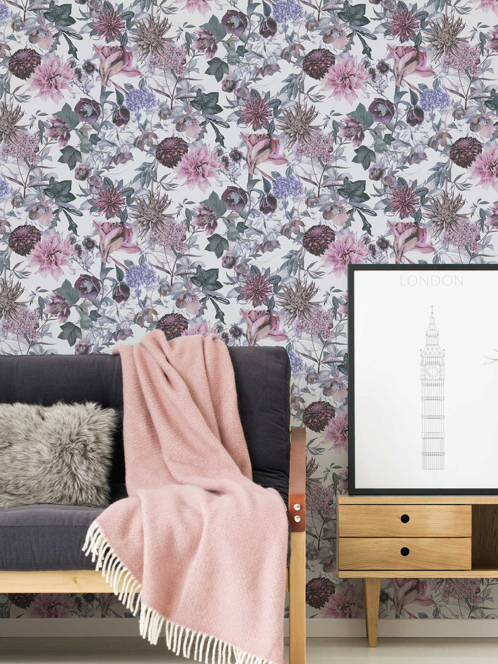 Tapetes ar džungļu rakstu vintāžas stilā violetos toņos, 1351514