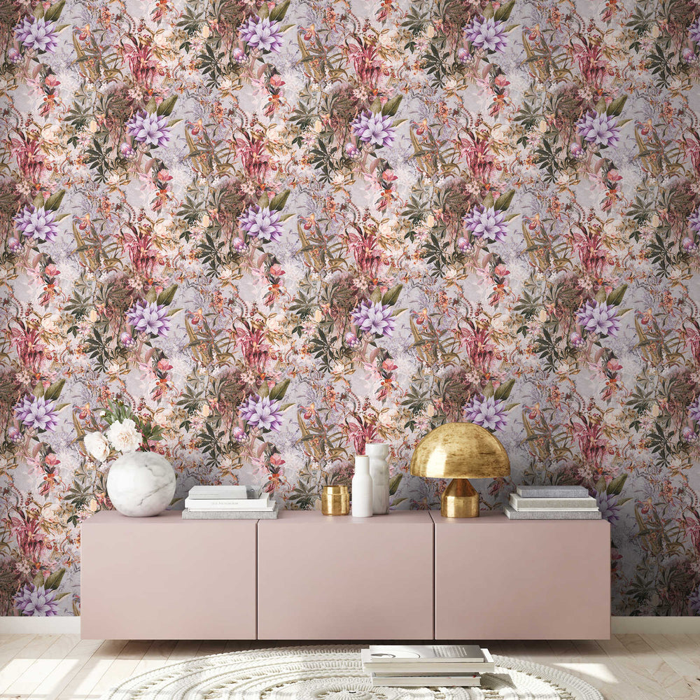 Tapetes ar eksotiskiem ziediem un putniem, bēšā, zaļā un rozā, 1351532