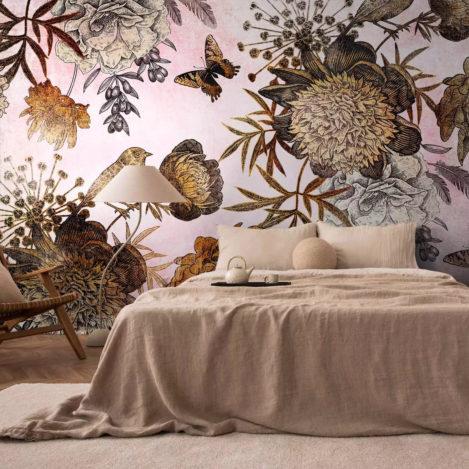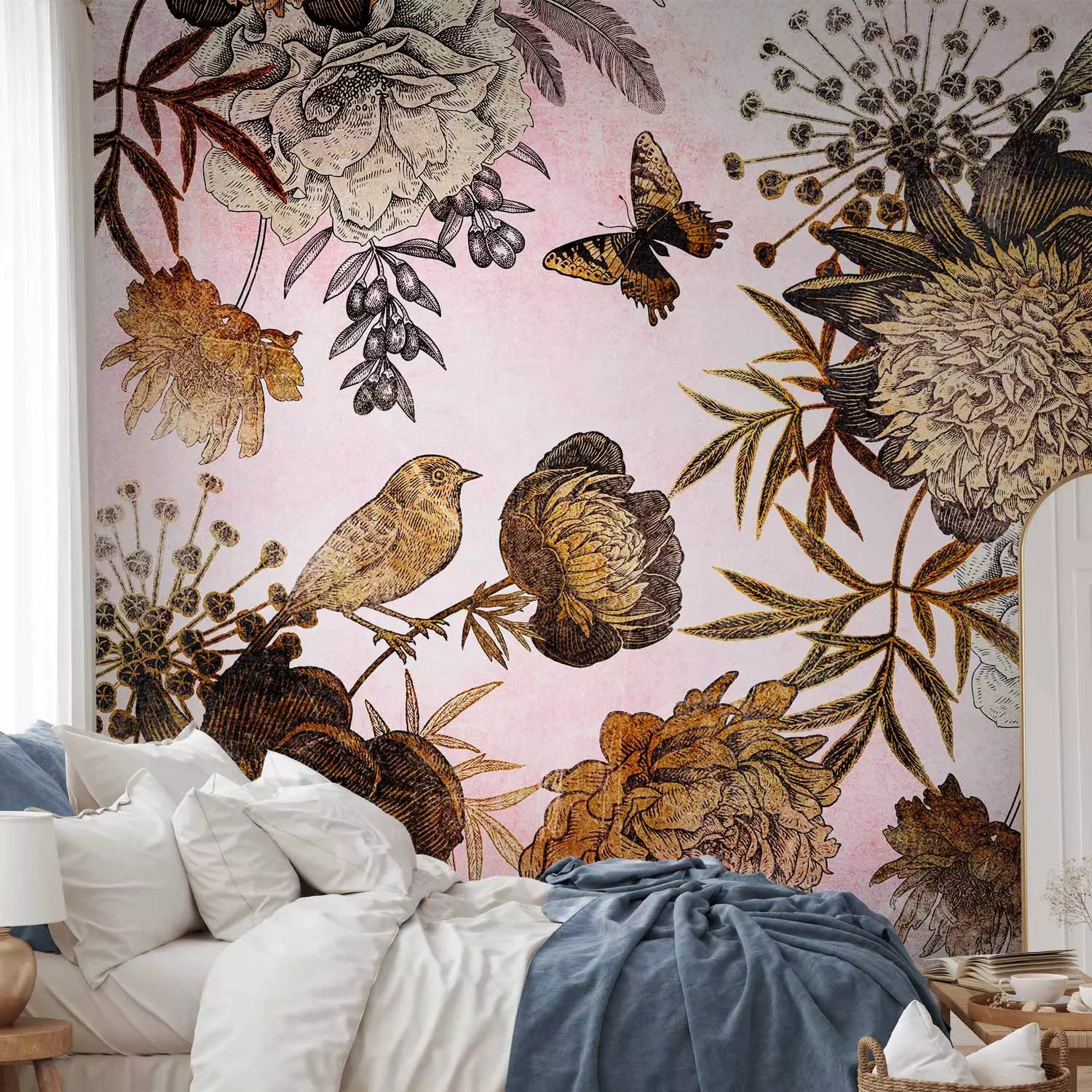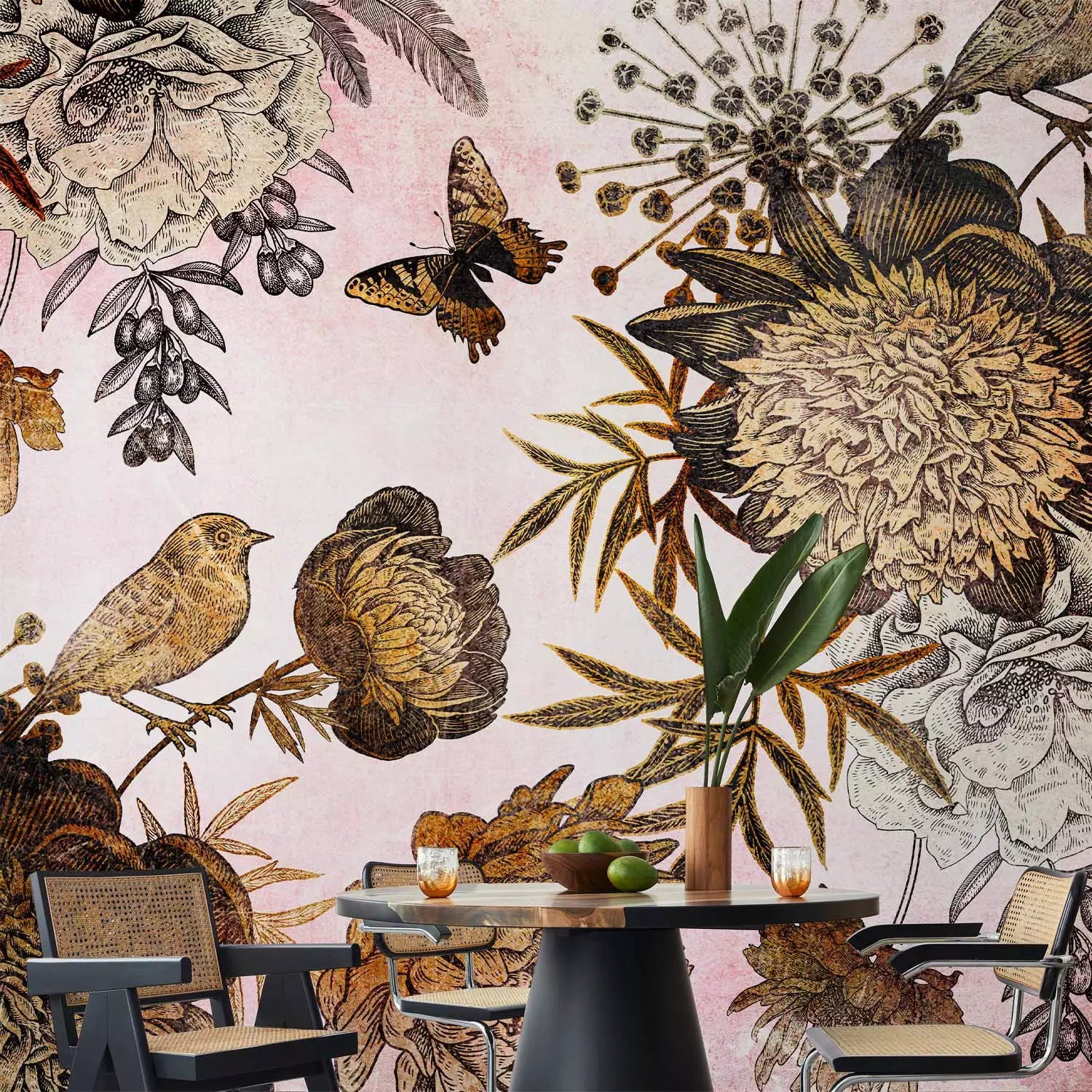 Fototapetes - Kompozīcija ar ziediem, putniem un tauriņiem, 138601