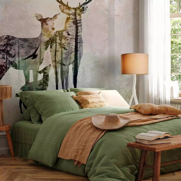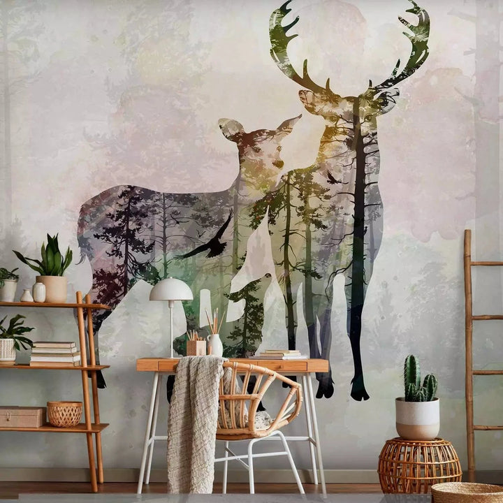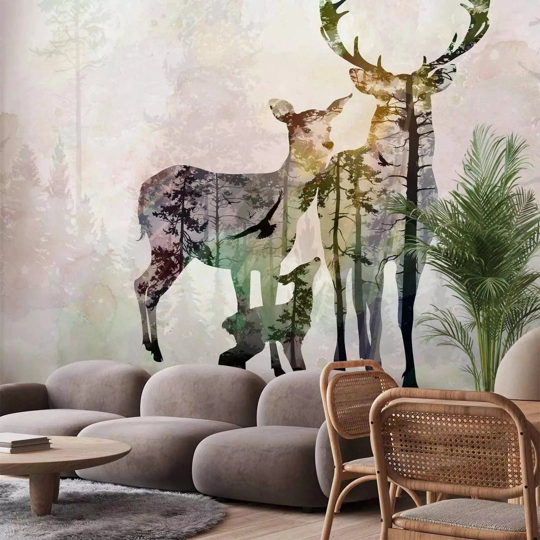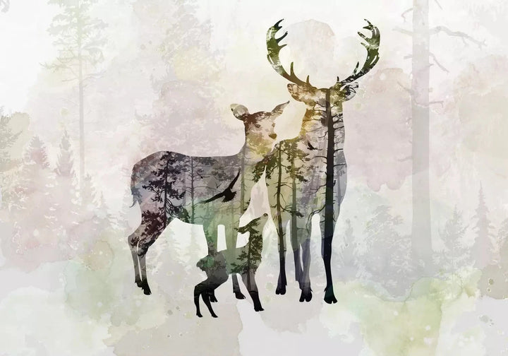 Fototapetes - Meža dzīve – abstrakcija ar briežiem uz meža fona - 128763