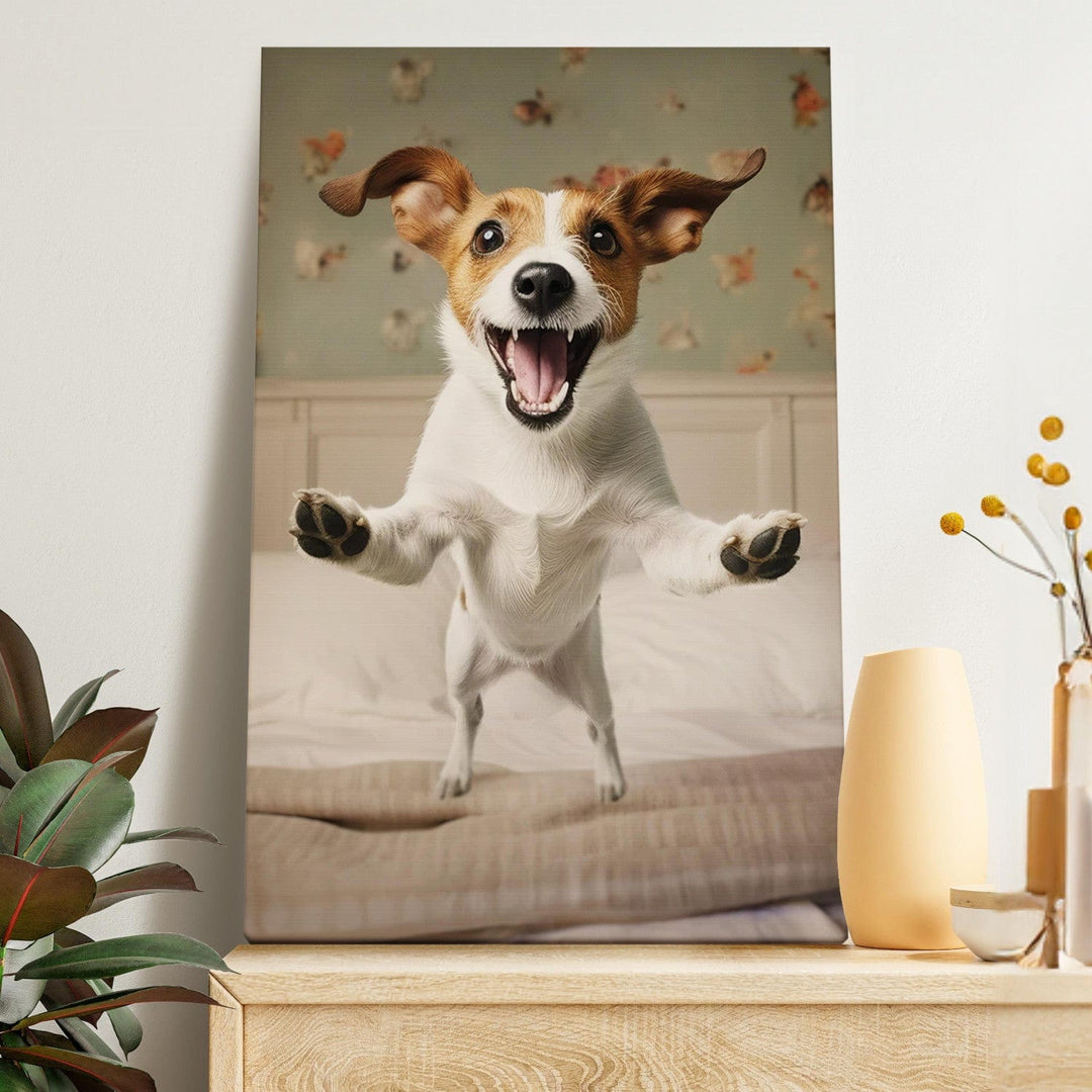 Kanva - Džeka Rasela terjers lec no gultas uz saimnieka rokām, 150235