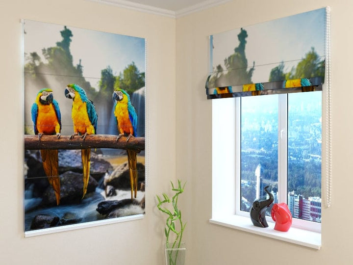 Romiešu žalūzijas ar krāsainiem papagaiļiem.