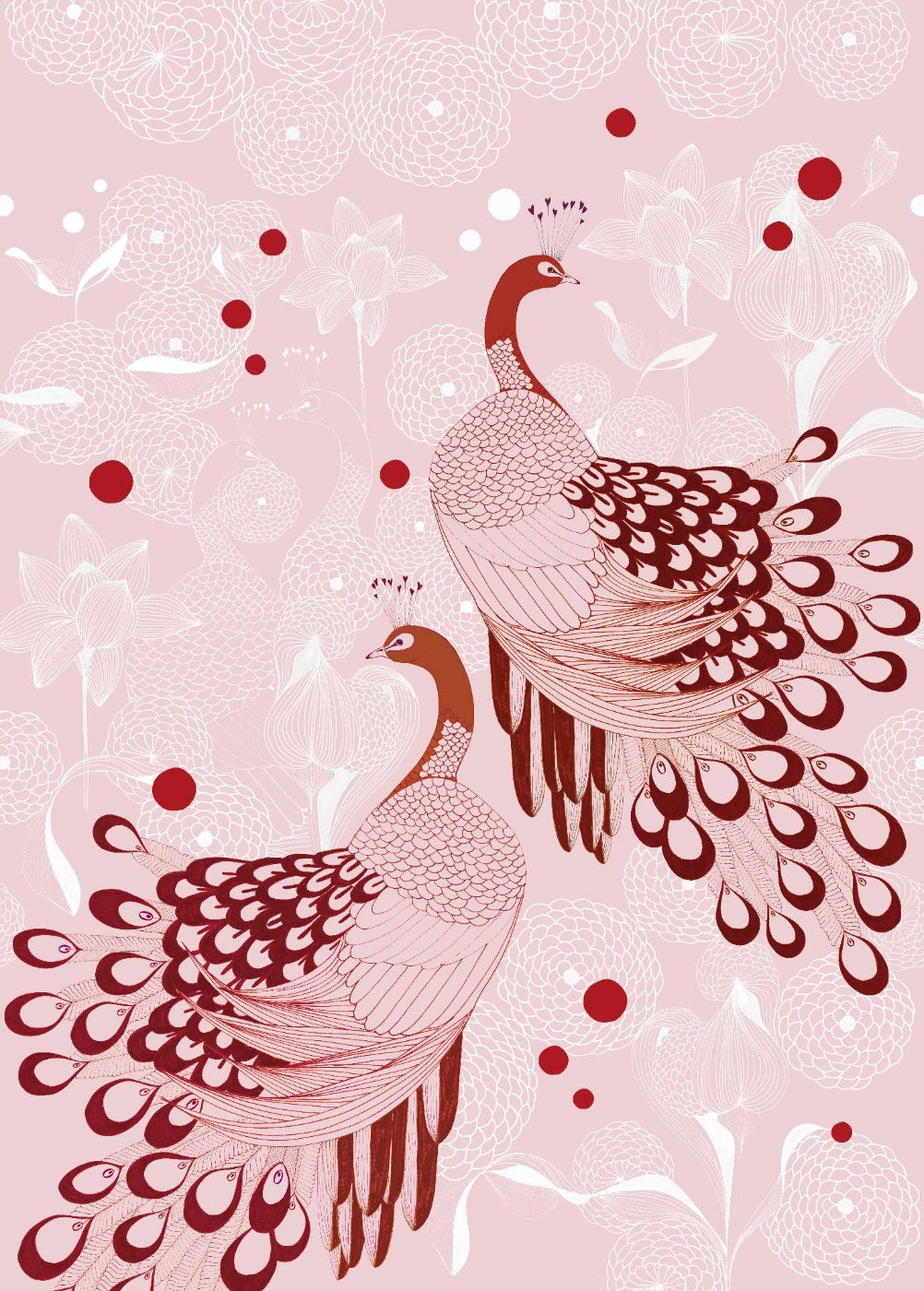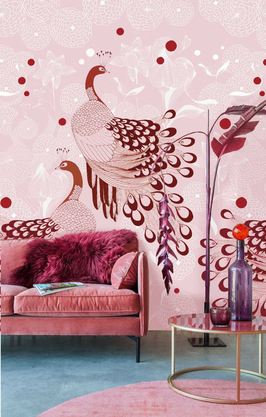 Šis sienu seguma dizains, kas ir lepns kā pāvs, noteikti piesaistīs apbrīnas pilnas acis. Ar izsmalcināti smalki zīmētām spalvām tapis apburošu dzīvnieku, maigu ziedu un eksotisku ziedu salikums. Skaisti saskaņoti sarkanā un sārti rozā toņos tas izskatās mūsdienīgi un vienlaikus mājīgi, kā arī rada pārsteidzošu iespaidu uz sienas.