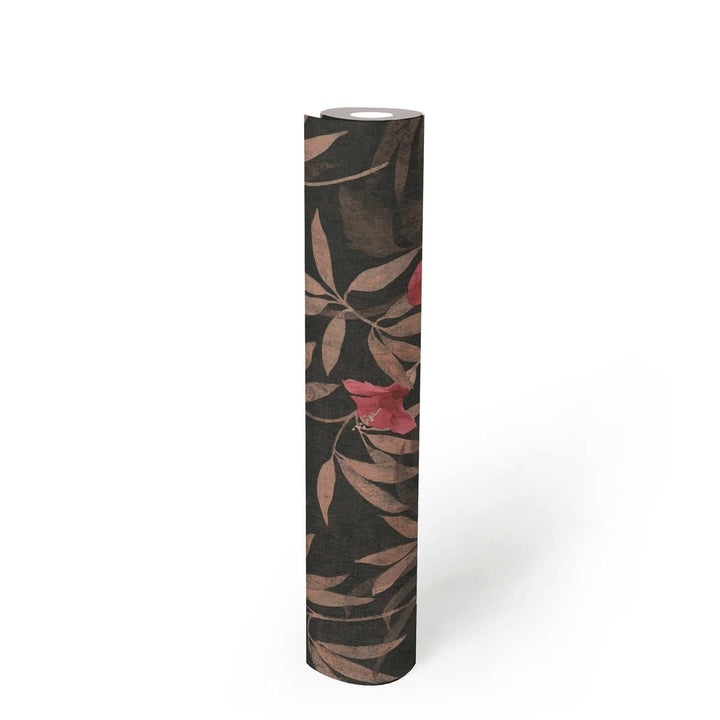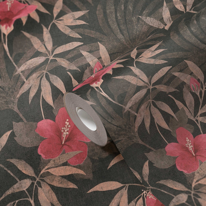 Džungļu tapetes, džungļi un hibiskusa ziedi - brūnā krāsā, 1346573