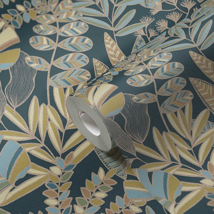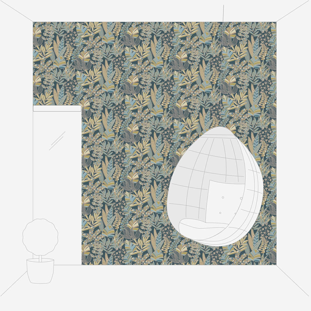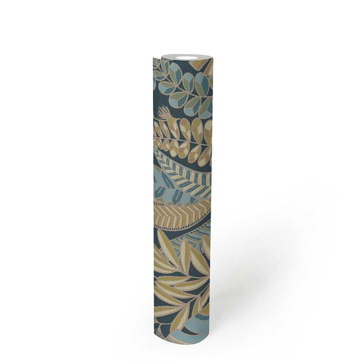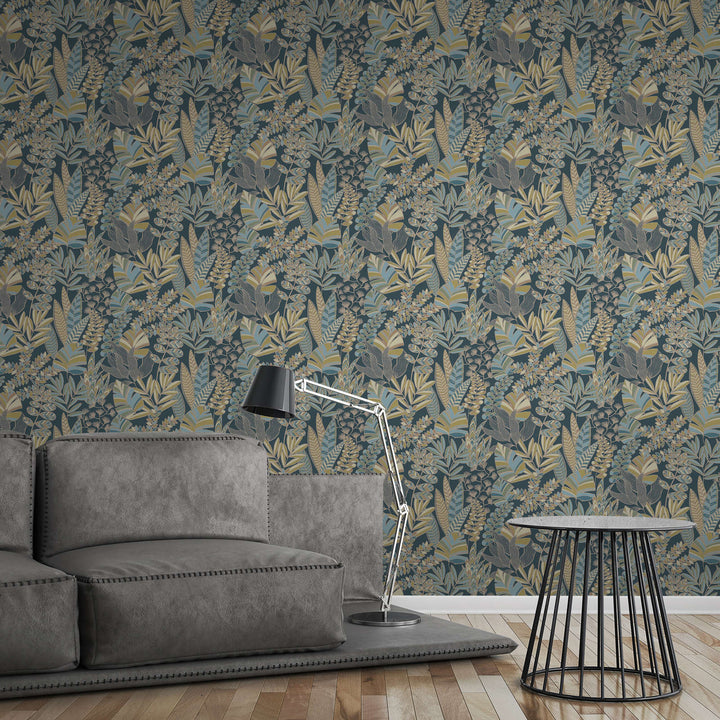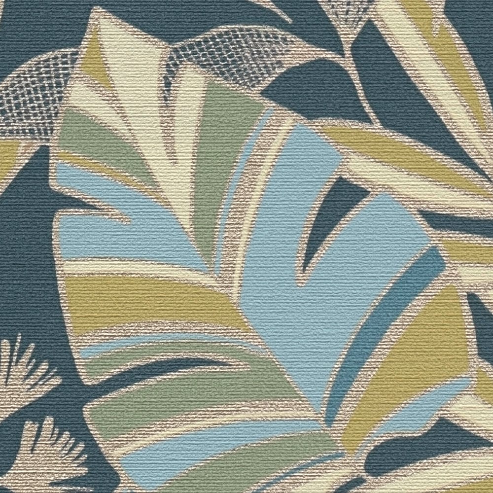 Džungļu stila tapetes ar spīduma efektu, zila, zaļa, zelta, 1373453