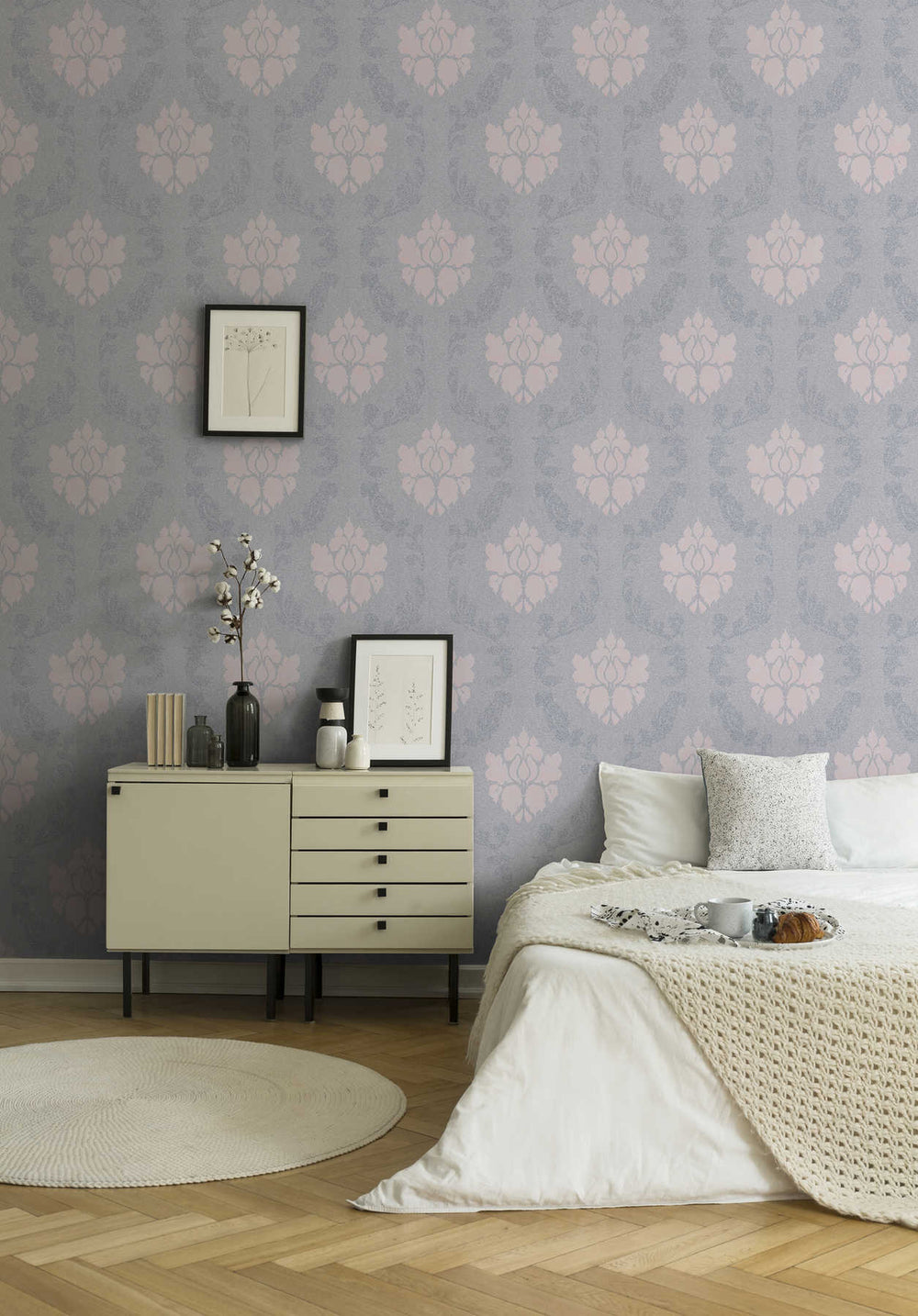 Flizelīna tapetes baroka stilā violetos toņos ar mirdzuma efektu – Grezns interjera akcents | 1410524 AS Creation