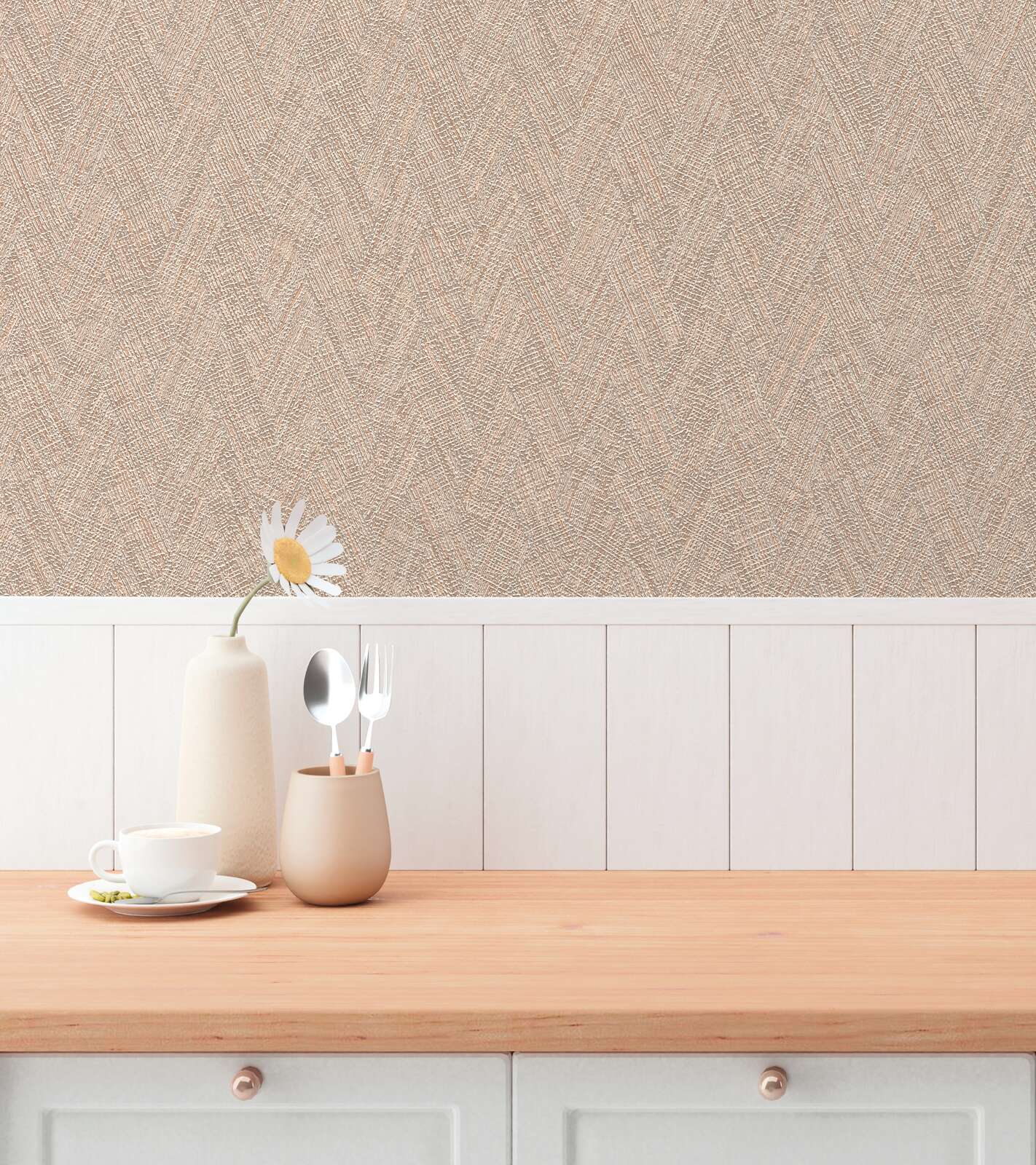 Motīvs attēlo smalku, austu zigzaga vai zigzaga rakstu, kas veidots no smalkām strukturētām līnijām. Krāsu gamma ir siltos, smilškrāsas un dabiskos toņos. Struktūra izskatās gandrīz kā audums un tādējādi rada mājīgu, patīkamu sajūtu, kas telpai piešķir siltumu un komfortu. Izturīgā krāsu gamma rada mierīgu atmosfēru un to var kombinēt dažādos veidos. Kopumā raksts rada dabisku, laikmetīgu eleganci un atgādina roku darba aušanas tehniku, neuzbāzoties.
