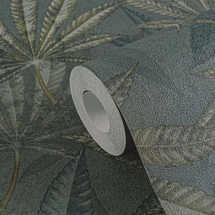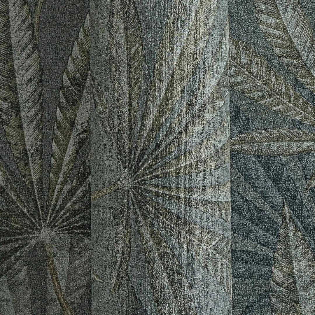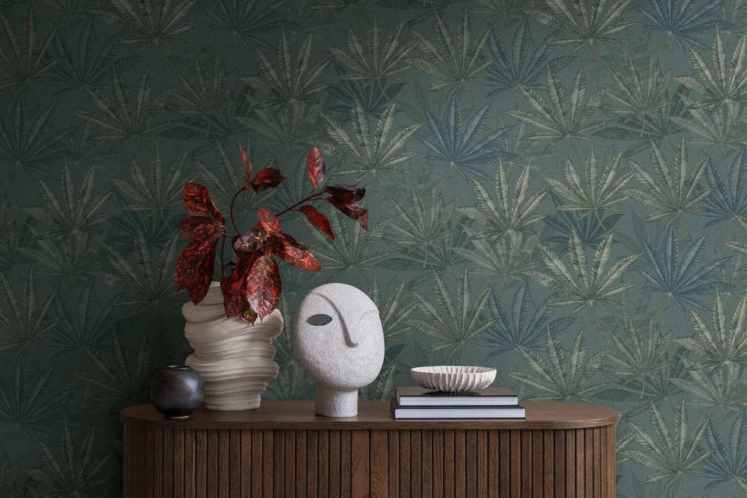 Tumši zaļās flizelīna tapetes ar lapu rakstu džungļu stilā rada tropiski intensīvu un greznu efektu.