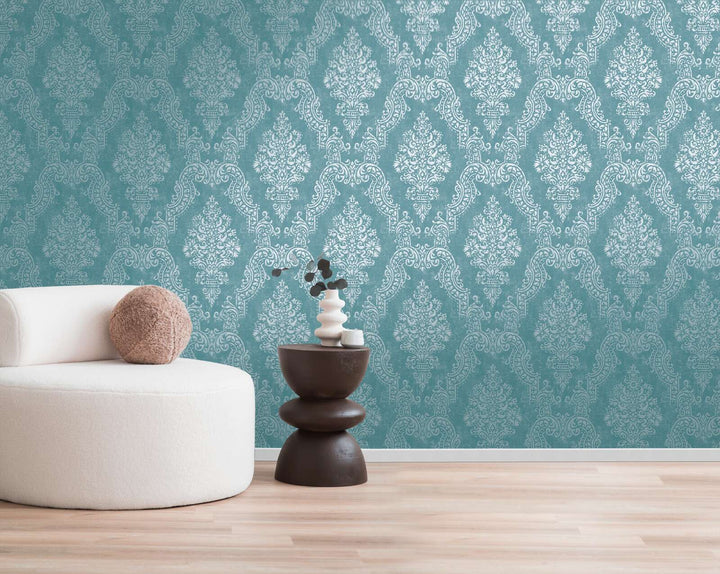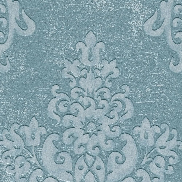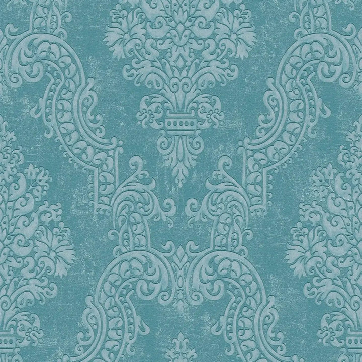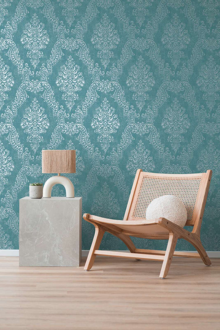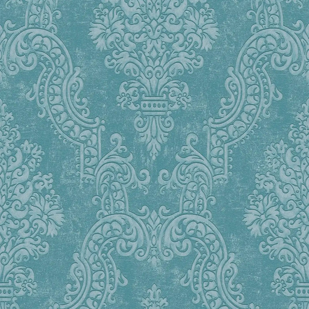 Flizelīna tapetes baroka stilā ar mirdzuma efektu tirkīzā krāsā (1410526), izmērs 0,53x10 m. Flizelīna bāze ar strukturētu, matētu un viegli mirdzošu virsmu – efektīvs akcents elegantām telpām.