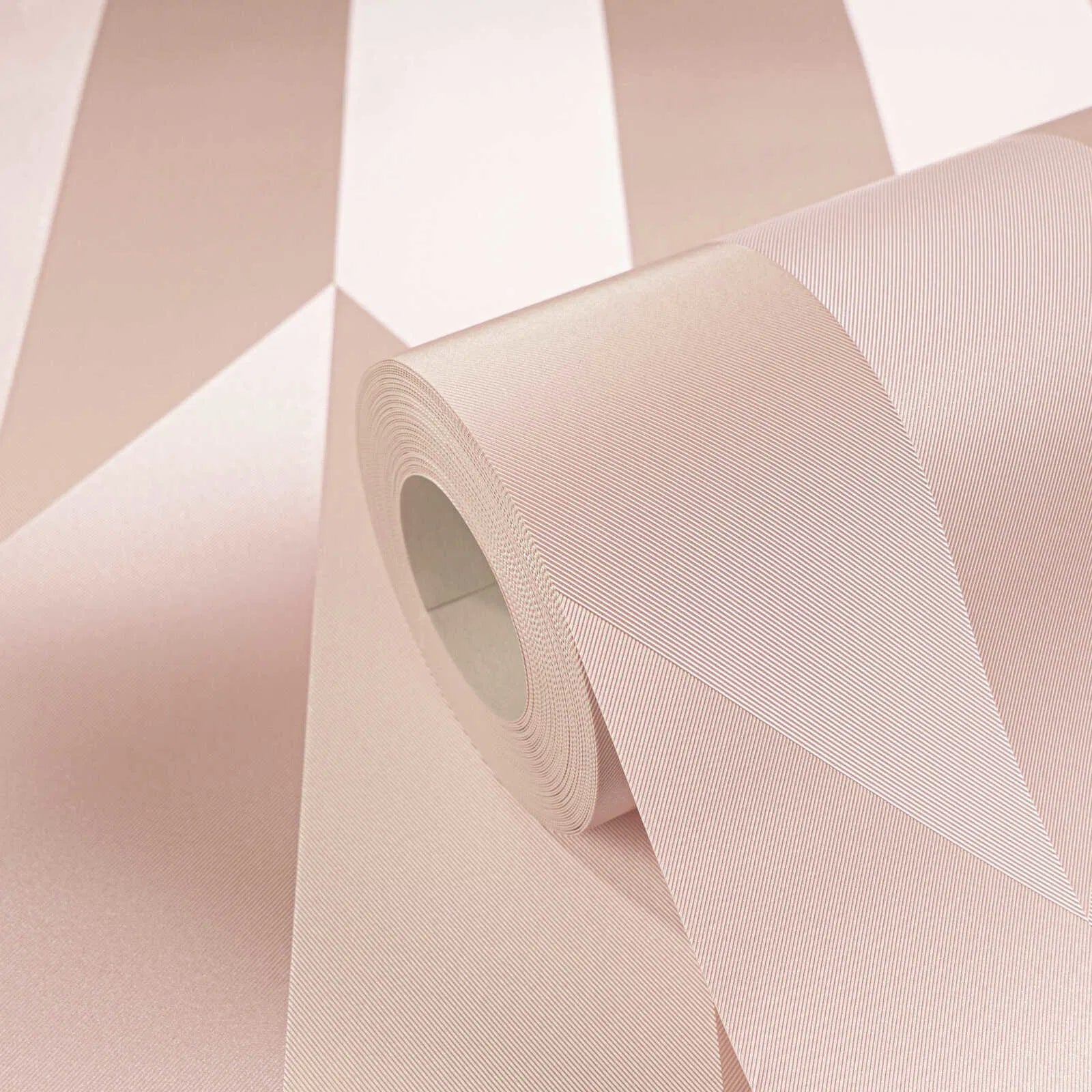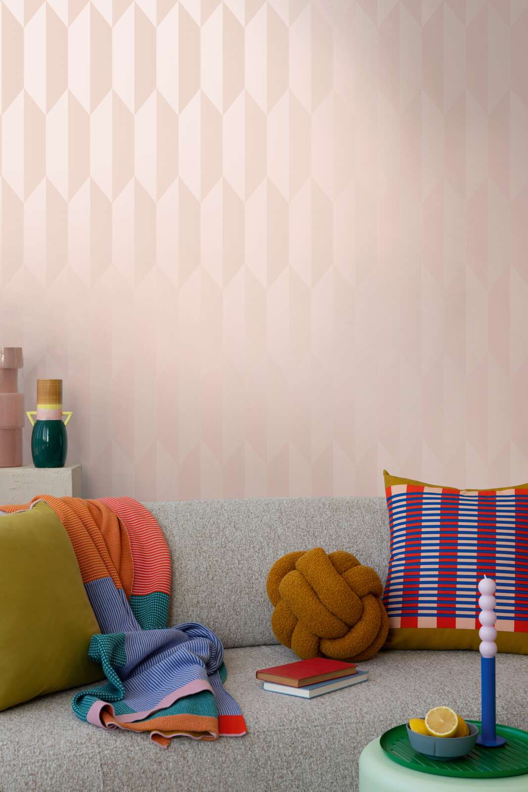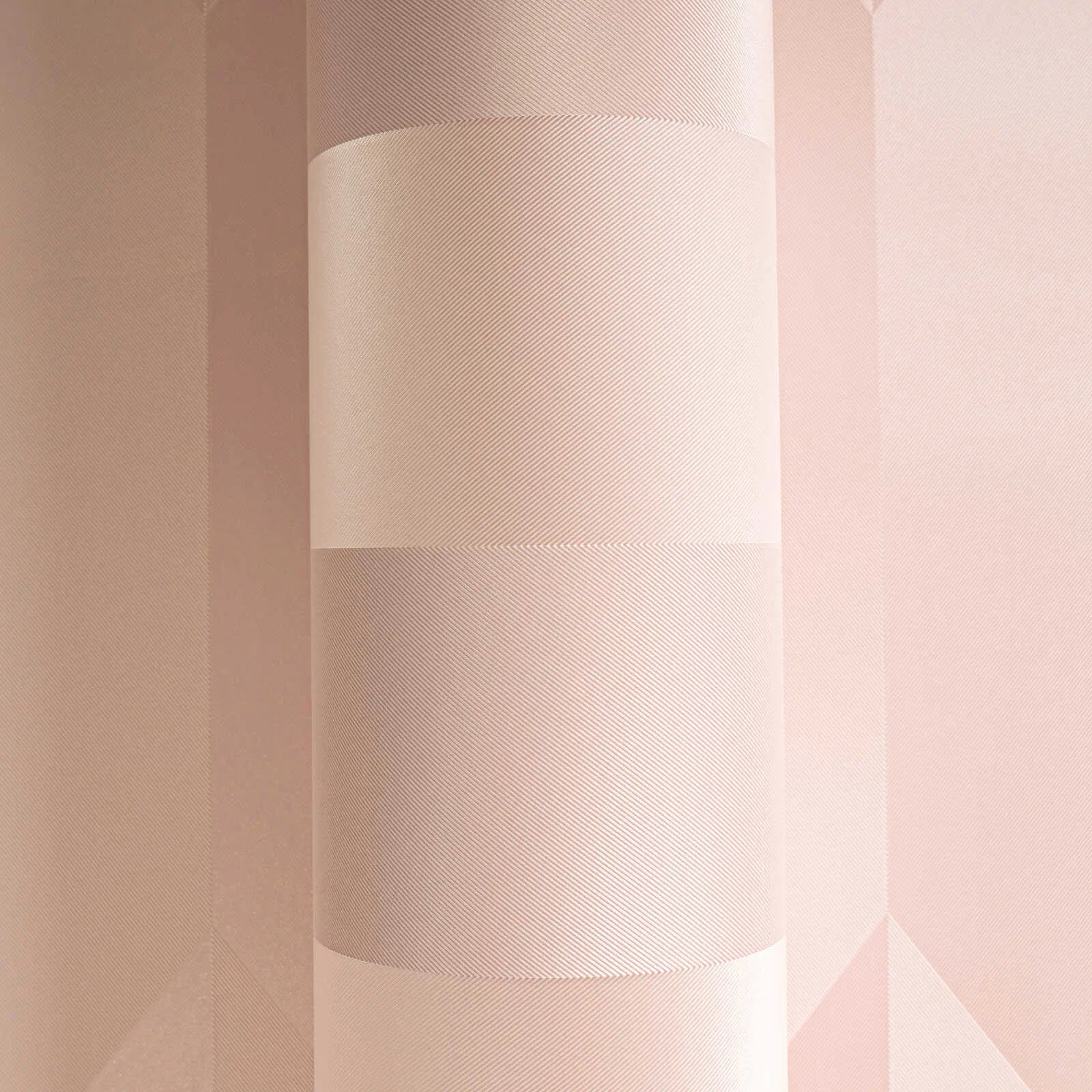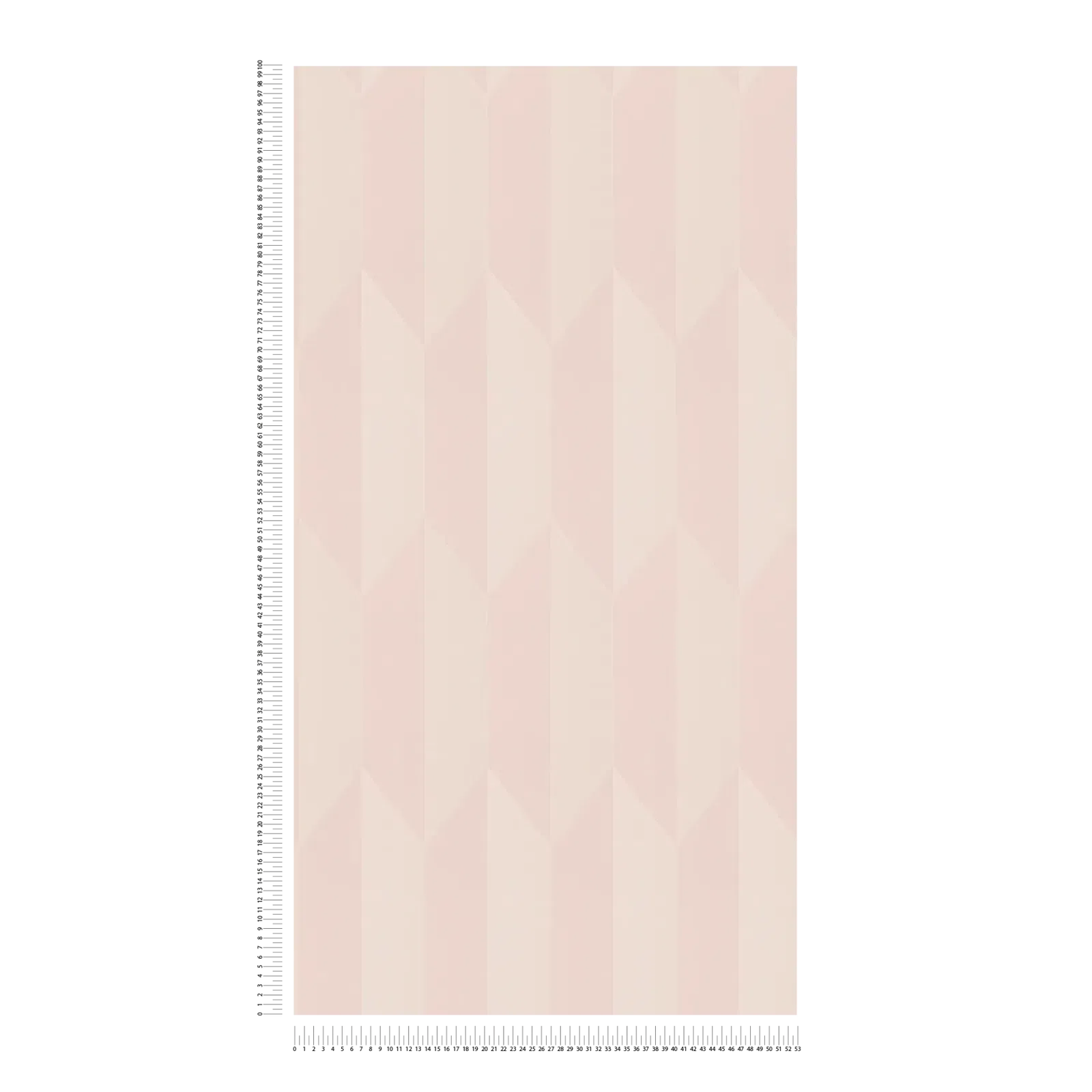 Tapešu motīvs sastāv no ģeometriska raksta ar iegarenām, rombveida segmentiem, kas saplūst vertikālu, regulāri izkārtotu paneļu sērijā. Atsevišķie elementi ir maigos rozā toņos un nedaudz krēmkrāsā, radot maigu, harmonisku krāsu pāreju. Formu izkārtojums rada smalku trīsdimensiju efektu un delikātu gaismas un ēnas spēli, neizskatoties uzmācīgi. Kopējais efekts ir mierīgs, moderns un nedaudz skandināvisks. Maigie, pūderveida krāsu toņi rada draudzīgu, nomierinošu atmosfēru un ir ideāli piemēroti, lai telpām piešķirtu gaišu, mūsdienīgu, bet mājīgu gaisotni.