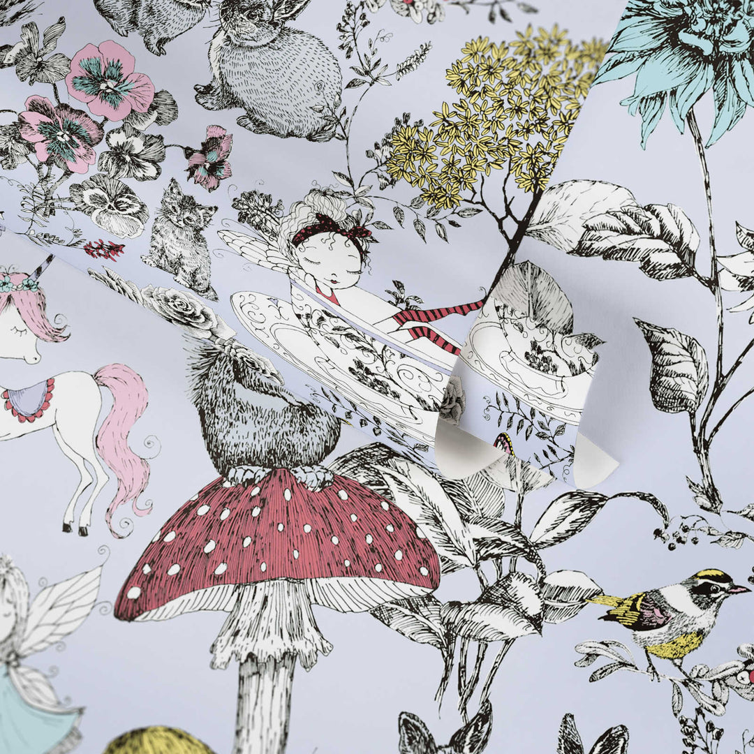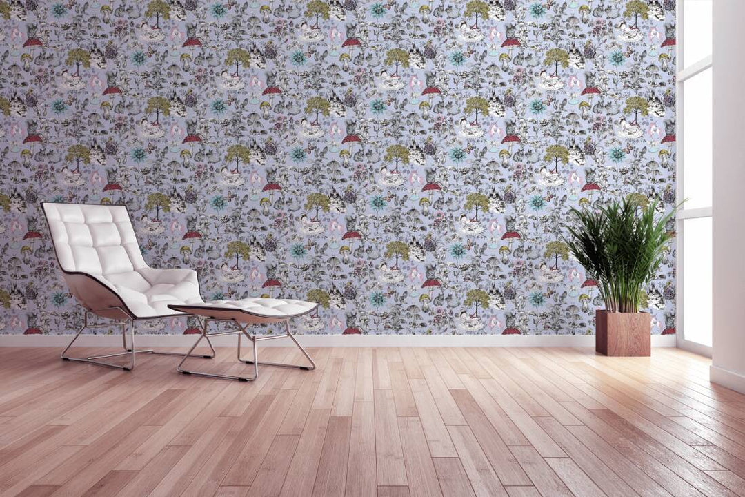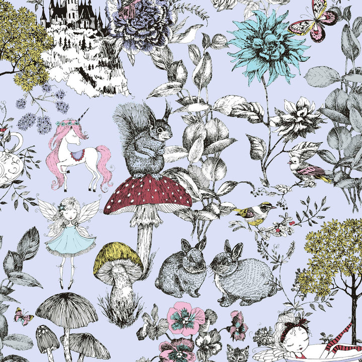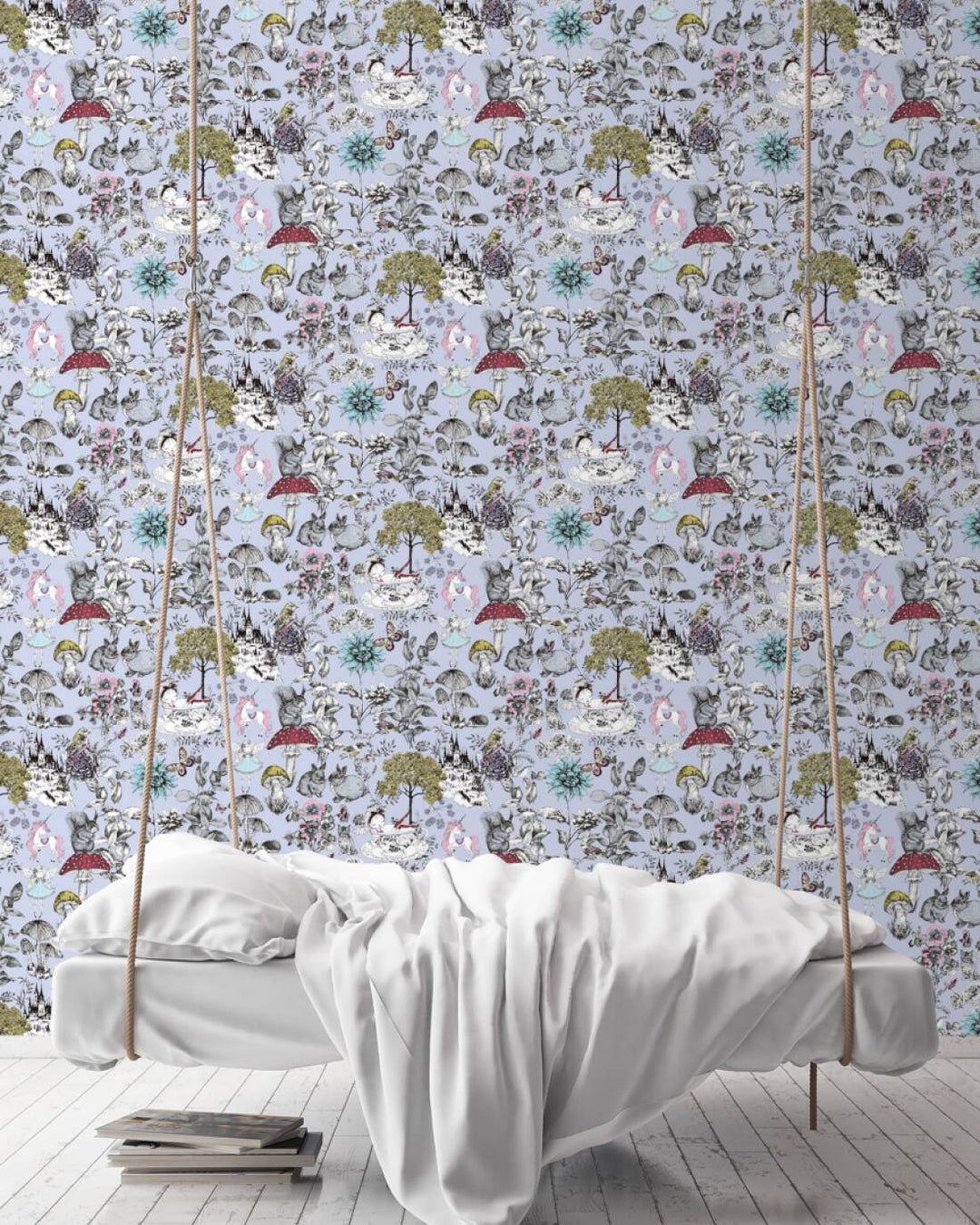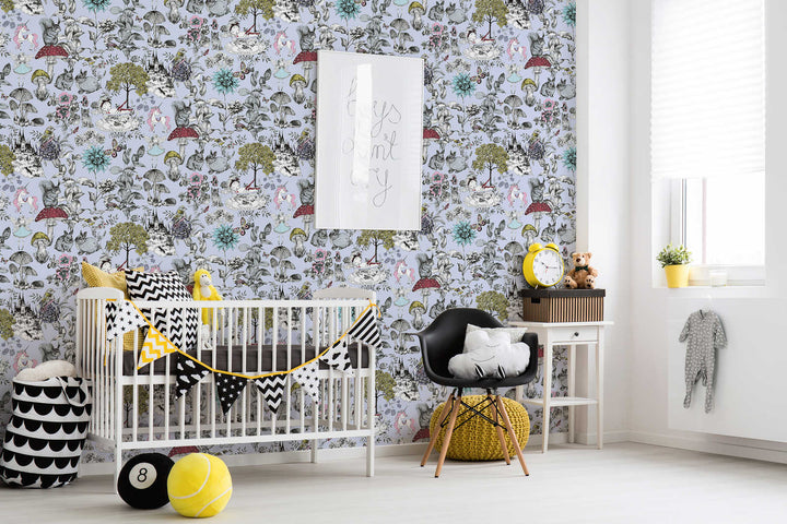 Tapetes bērnu istabai ar pasakas motīvu un dzīvniekiem: trušiem, kaķiem, ezīšiem, taureņiem, vāverēm vienradžiem un pasakainam fejām - pelēkos tonos.