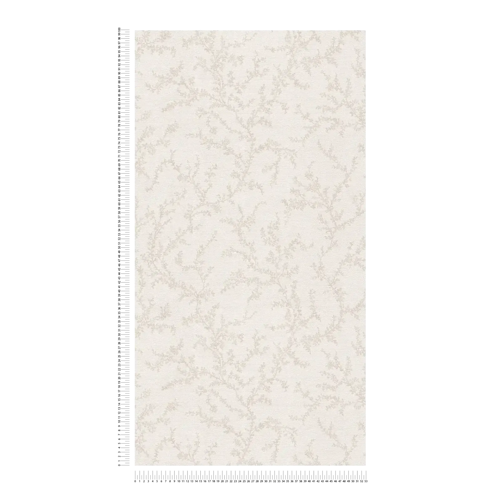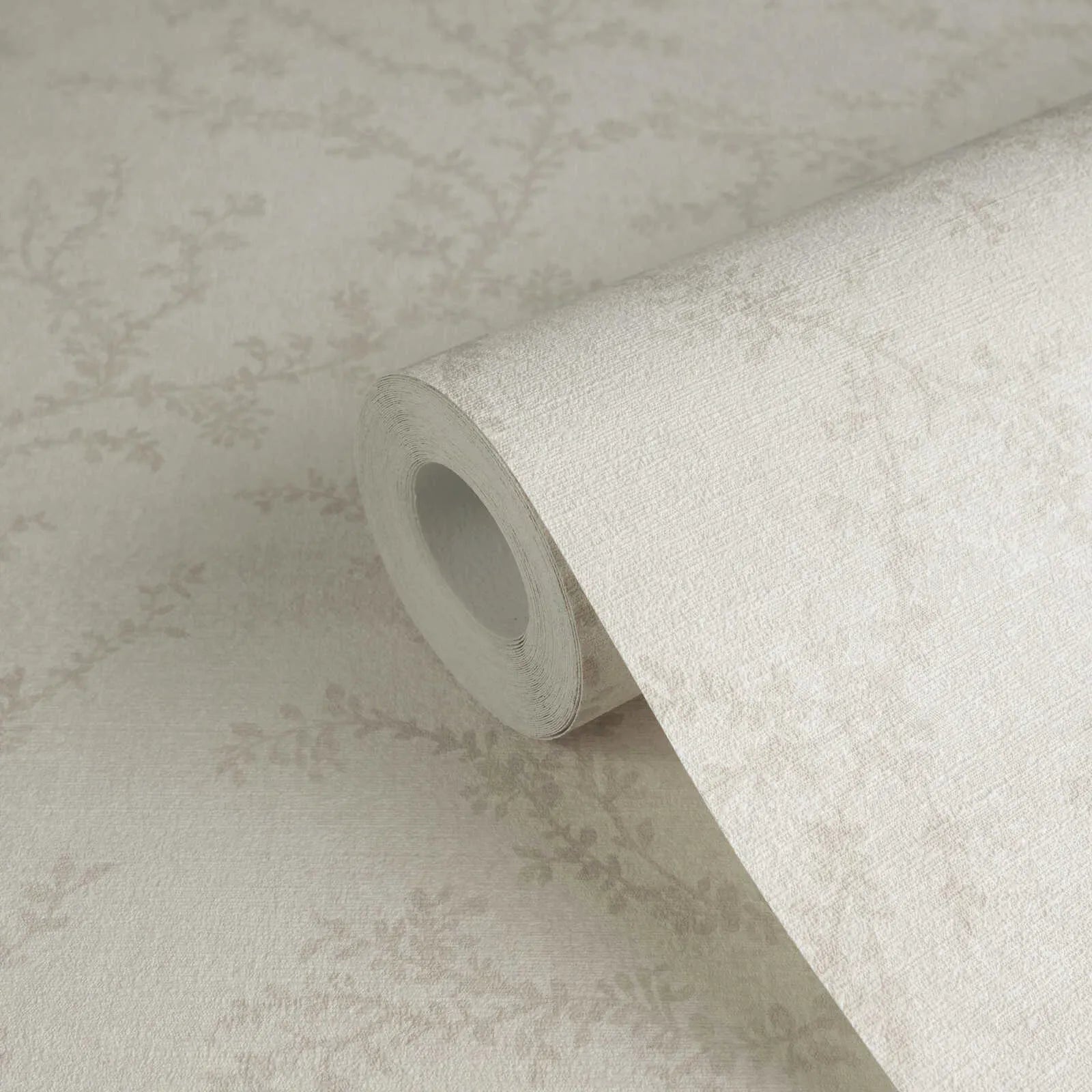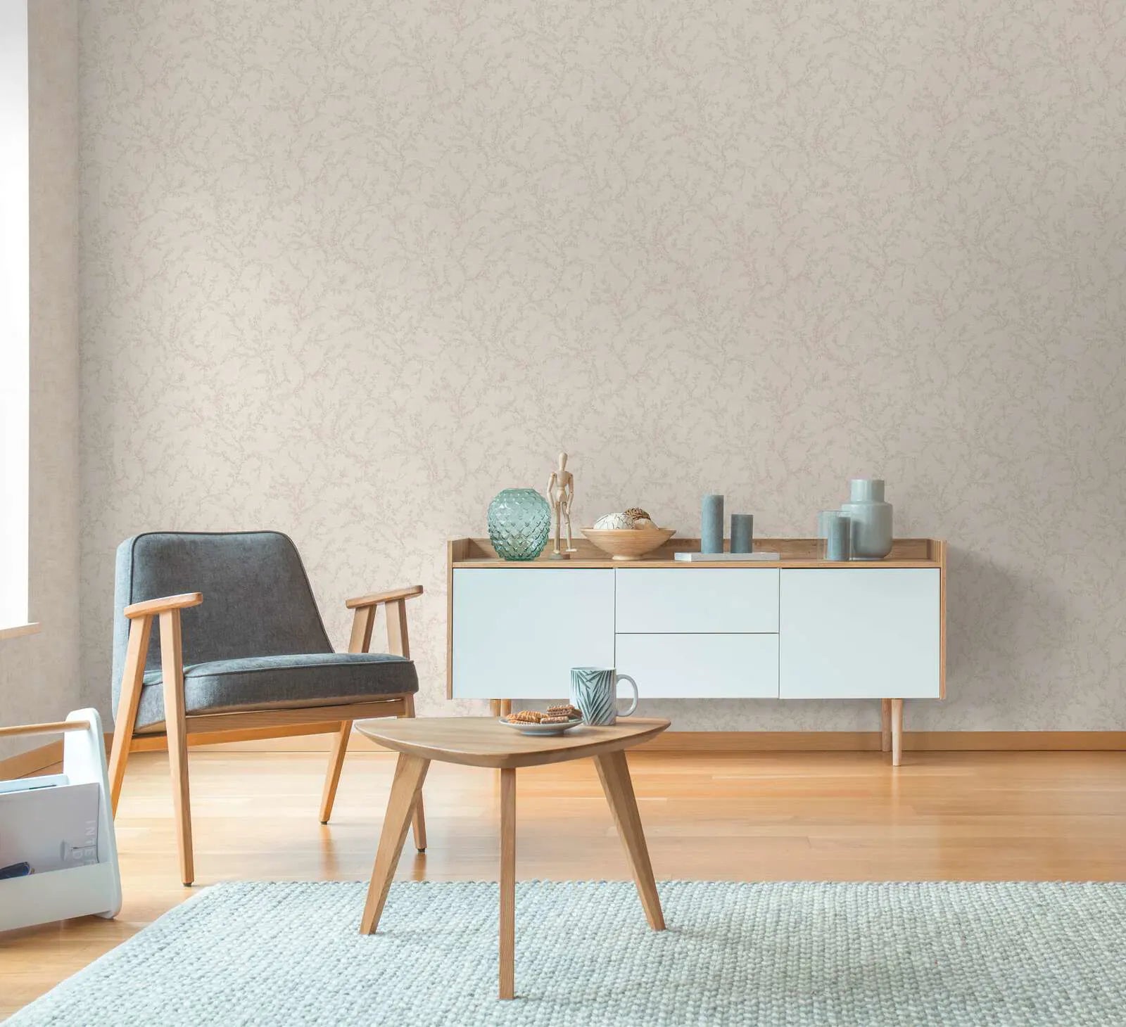 Delikāti zarojušies vītņi nedaudz ziedu, organiska raksta izkārtojumā stiepjas pāri gaišam, krēmkrāsas līdz smilškrāsas fonam. Smalki zari un lapas izskatās tā, it kā tās būtu uzklātas ar vieglu otu, radot maigu, neuzkrītošu izskatu. Krāsu gamma diskrēti mainās toņu niansēs no siltā smilškrāsas līdz baltam, radot mierīgu, harmonisku noskaņu. Raksts nav uzkrītošs un šķiet gandrīz iegravēts virsmā, padarot tapetes elegantas un mūžīgas. Izskats ir atturīgs un elegants, un tas ir īpaši piemērots gaišām, draudzīgām telpām, kurās vēlas radīt dabas iedvesmotu atmosfēru.