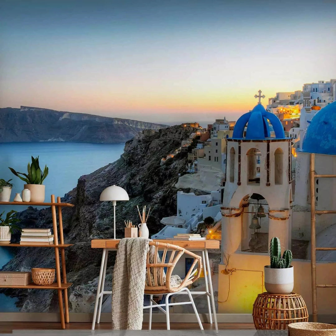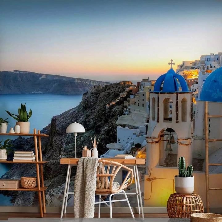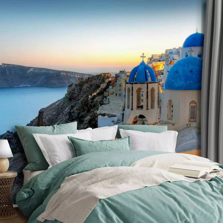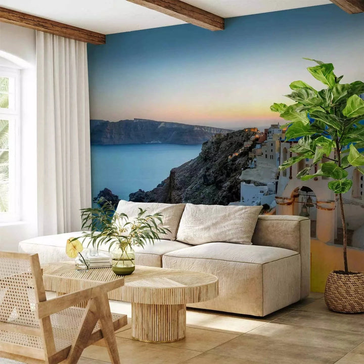 Fototapetes - Thira saulrietā – grieķu jūras ainava ar arhitektūru - 136088