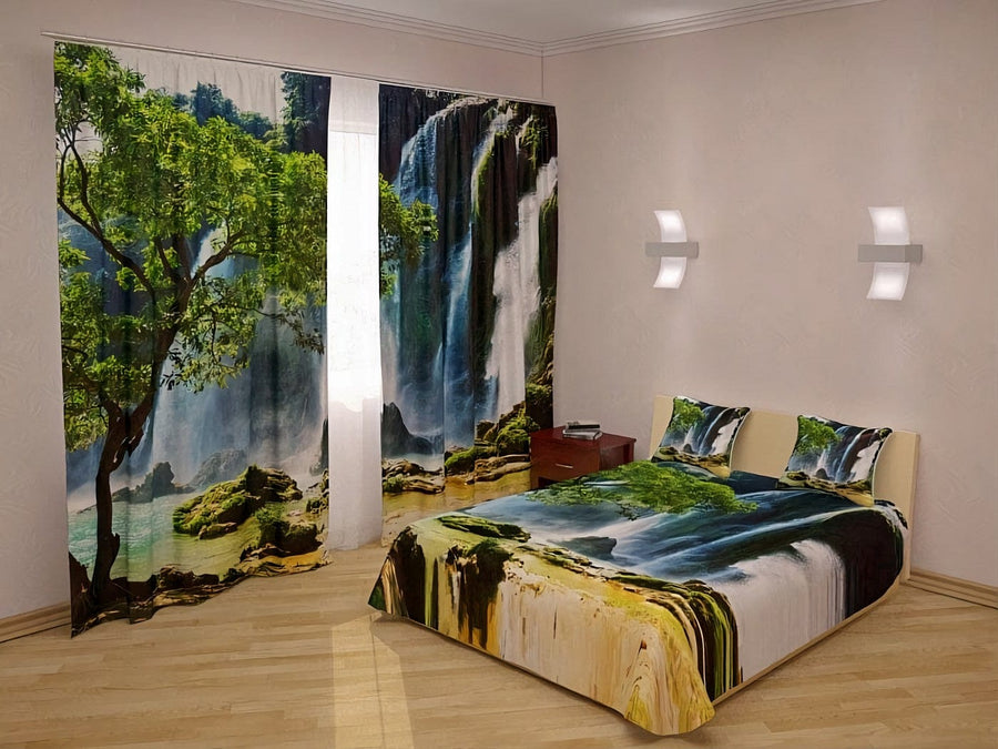 Gultas pārklājs ar dabu - Koks pie ūdenskrituma