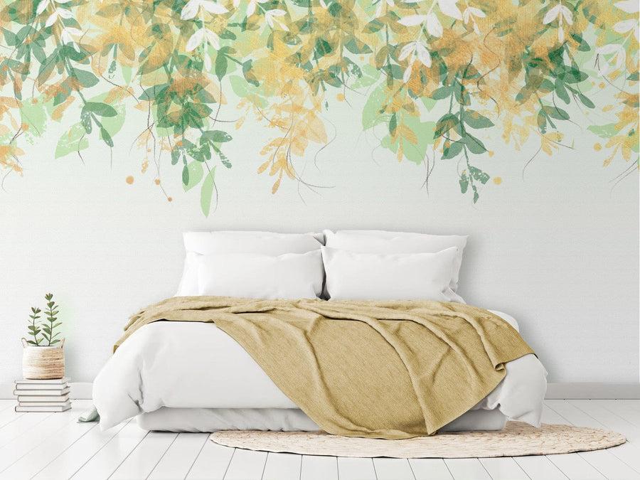 Fototapetes ar lapām uz balta fona, zaļa, balta, dzeltena, 142585 G-ART