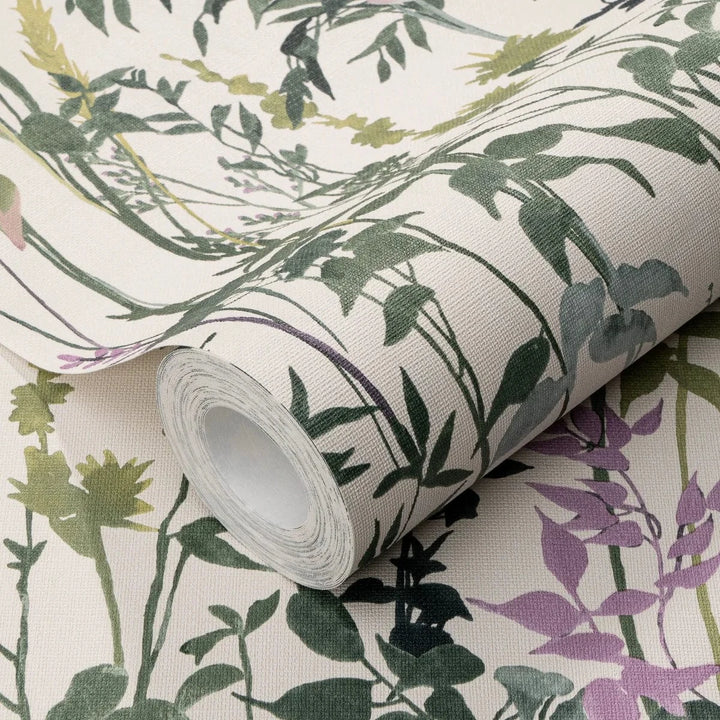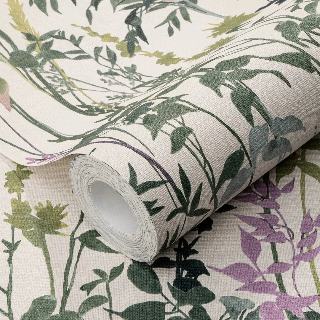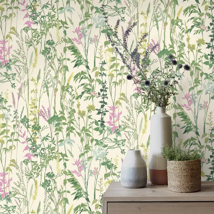 Krēmzaļas lauku stila tapetes ar dabas motīvu ideāli piemērotas mierīgai un siltai telpas atmosfērai.