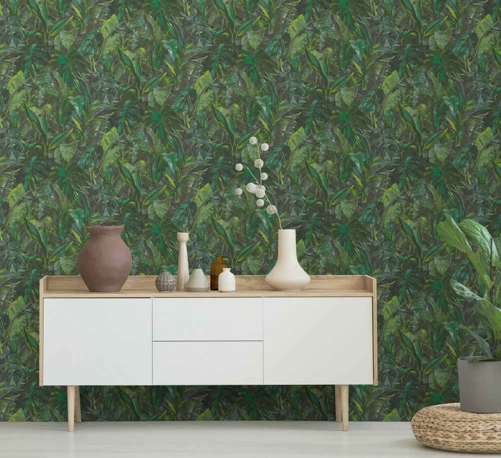 Tapetes botāniskā stilā ar eksotiskām lapām, zaļā krāsā - 3710457 Erismann