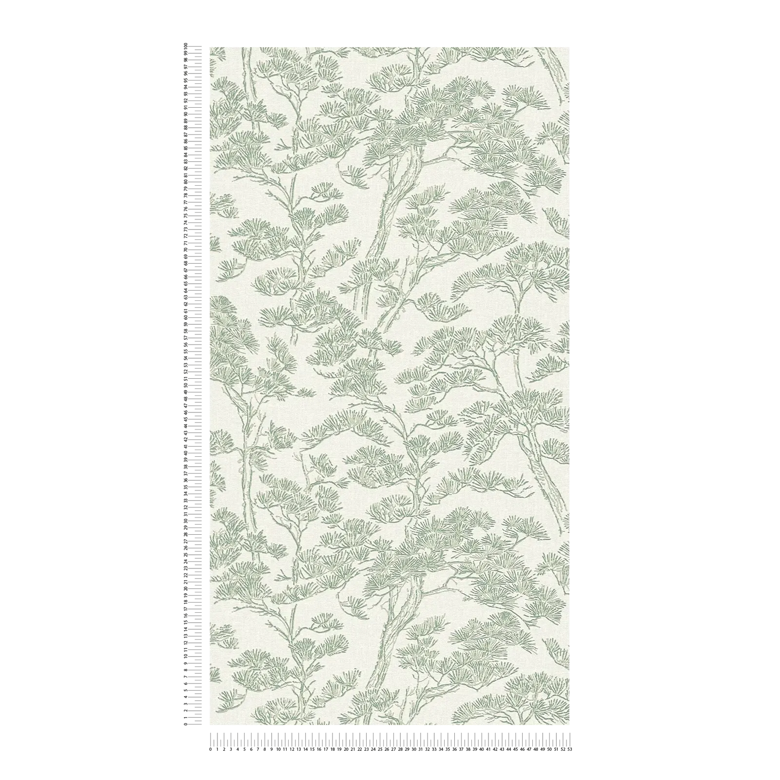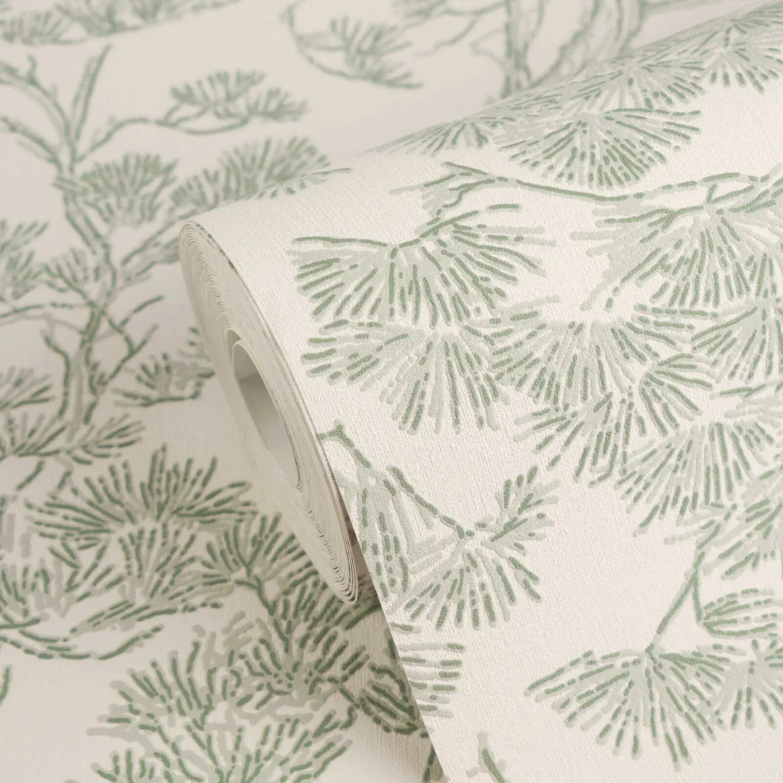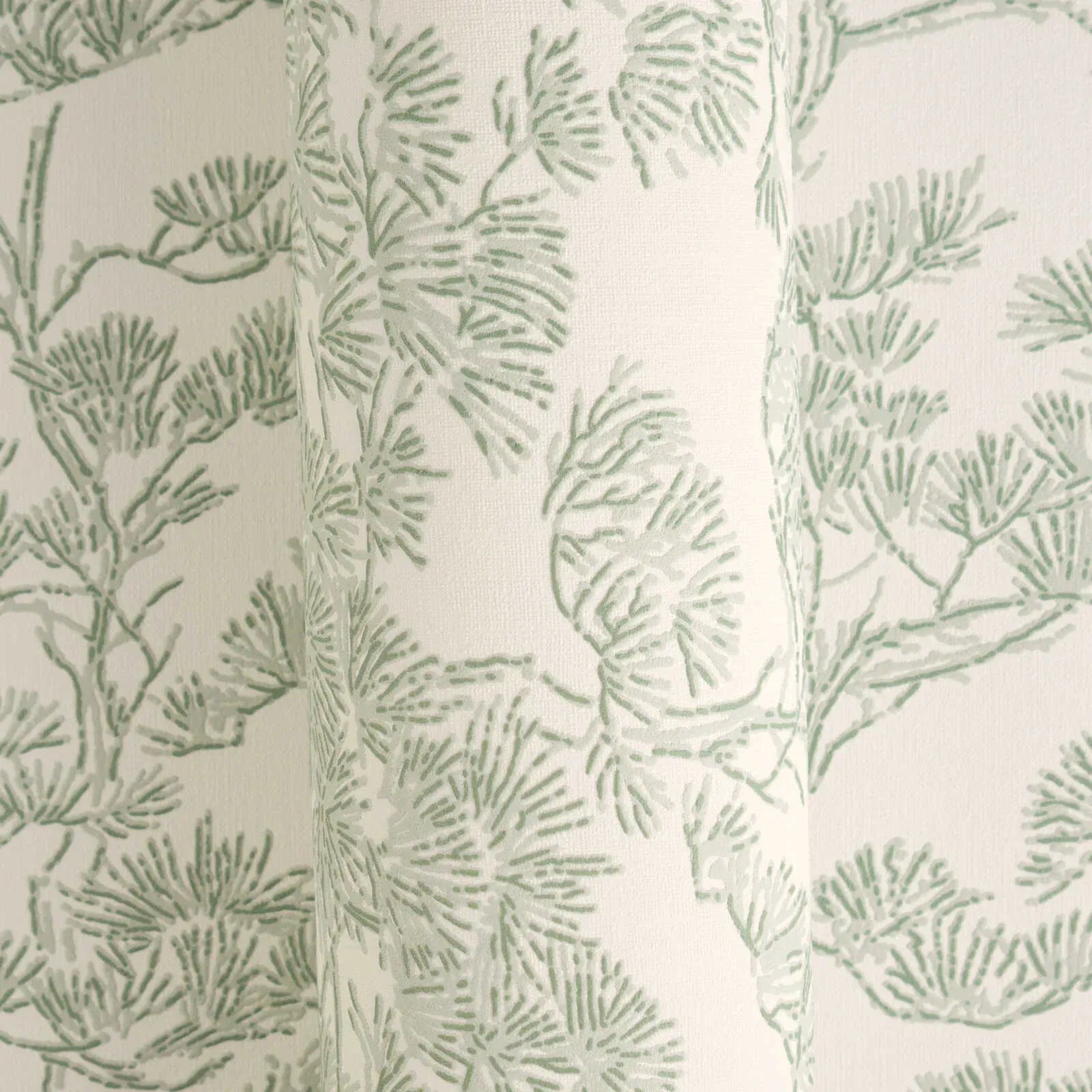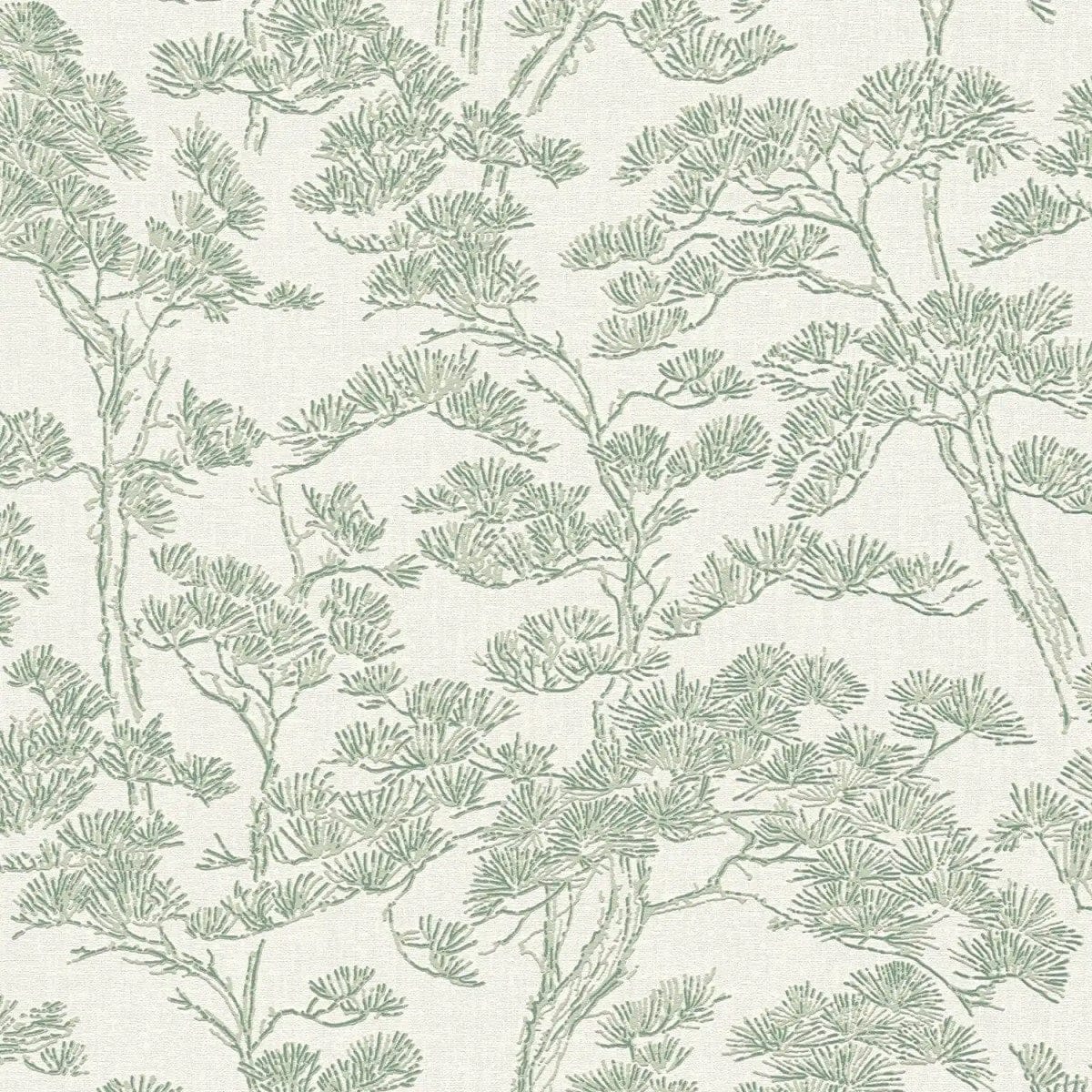 Smalkas, detalizētas līnijas maigā salvijas zaļā krāsā veido filigrānu, botānisku rakstu uz gaiša, nedaudz krēmkrāsas fona. Motīvs atgādina stilizētas priežu zaru, kuru smalkās skujas un plānie zariņi ir harmoniski izkliedēti pa virsmu. Kompozīcija izskatās gaisīga un mierīga, gandrīz kā Āzijas tušas zīmējumi, radot smalku, dabisku eleganci. Maigā zaļā un atturīgā baltā krāsu palete piešķir rakstam svaigu, nomierinošu auru. Kopumā tapetes izskatās eleganti, laikmetīgi un dabīgi, vienlaikus radot vieglumu un smalku dekoratīvu efektu telpā.