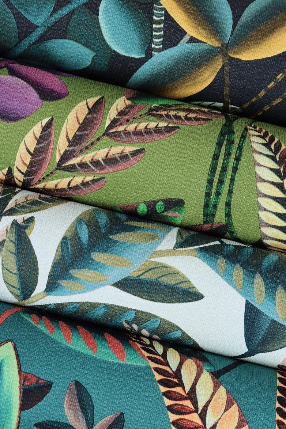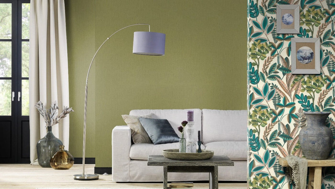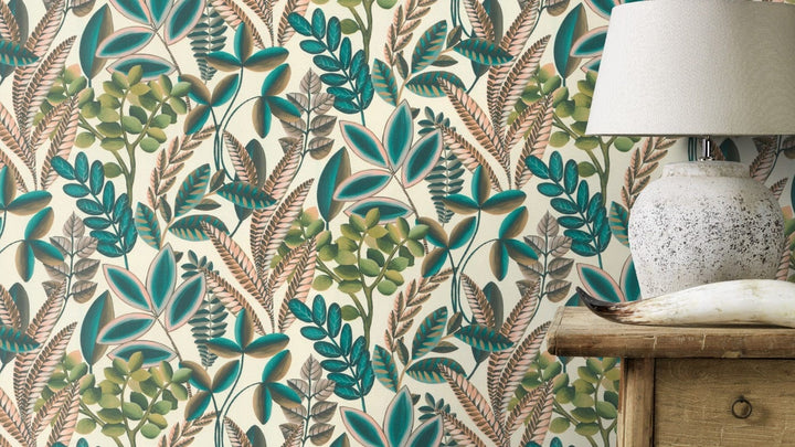 Alise Brīnumzemē ar šo rakstaino sienu segumu varētu justies kā mājās jebkurā telpā. Uz fona ar elegantu audumam līdzīgu faktūru ir attēlots izdomas bagāts augu klāsts. Krāsainie augi ir dažādos zaļo lapu, tirkīza zilā, olīvu zaļā un persiku krāsas toņos, un tie patiešām piesaista skatienu.