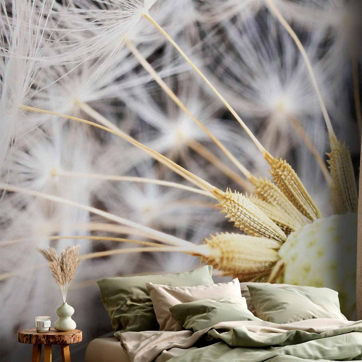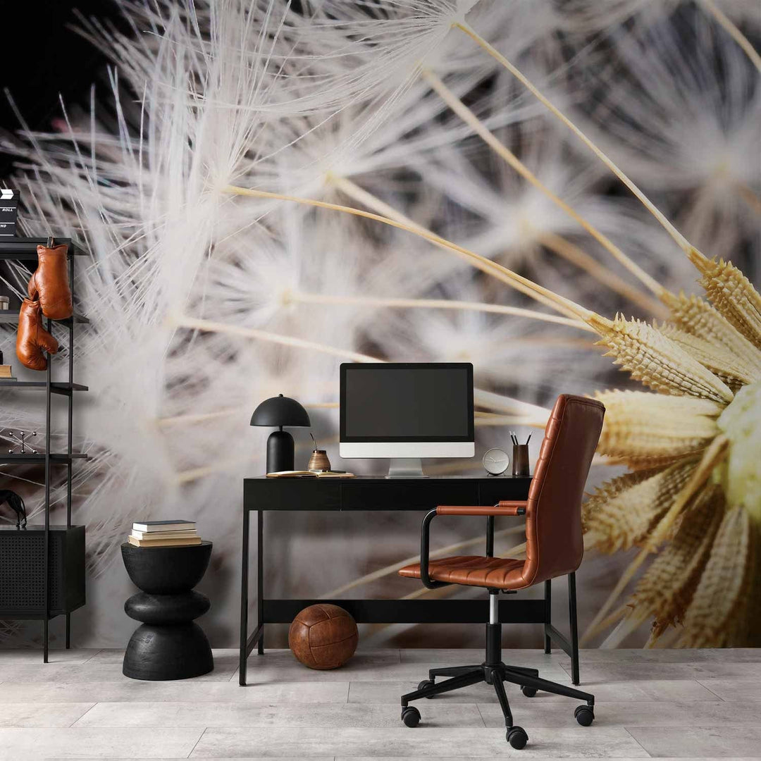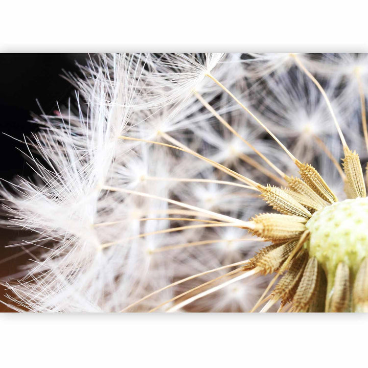 Fototapetes - Pūkainas pienenes zieds uz melna fona tuvplānā , 60151
