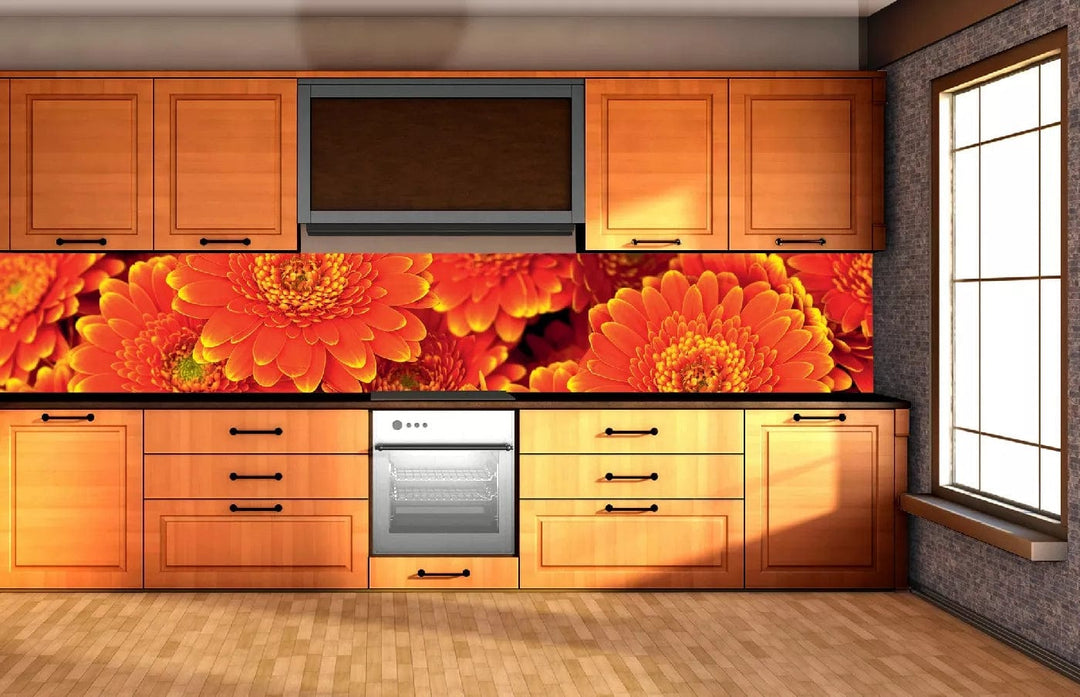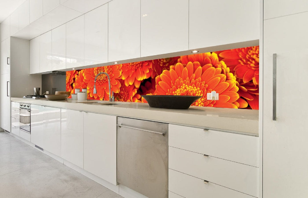 Fototapetes virtuvei ar lamināciju, pašlīmējošas plēve un flizelīns - Gerberas (350x60 cm)