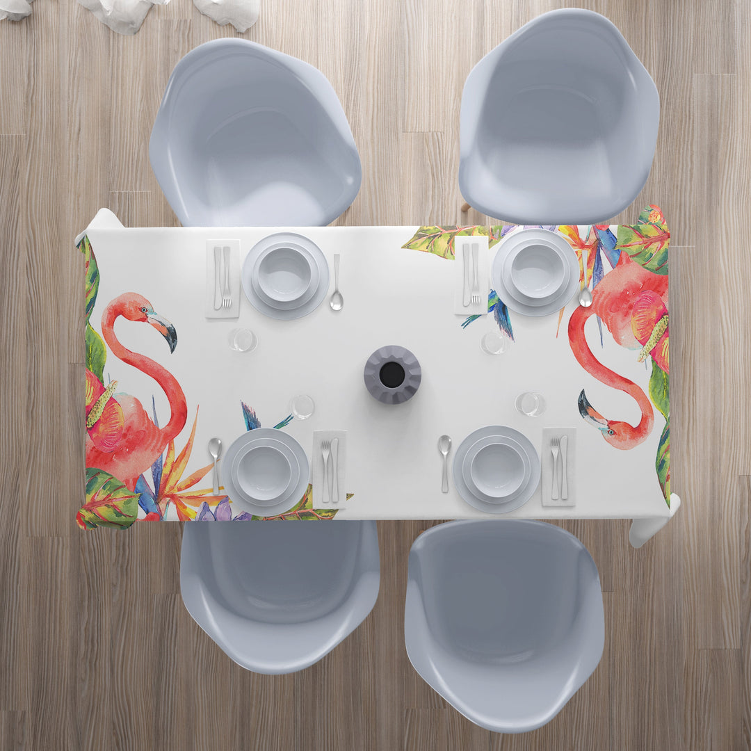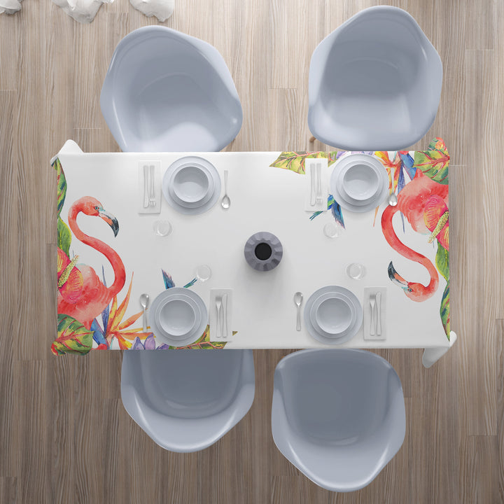 Galdauts ar rozā flamingo un tropiskiem ziediem