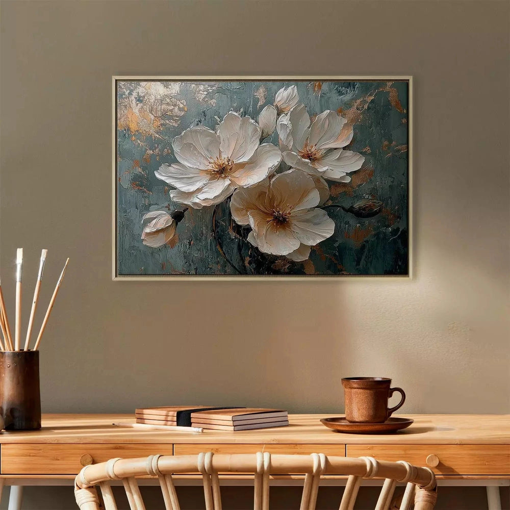 Glezna koka rāmī (dabīgā krāsā) - balti ziedi uz zila un zelta fona, 162002