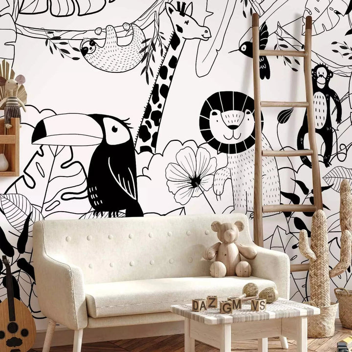 Melnbaltas fototapetes bērnistabai - Laimīgi džungļi, 143563